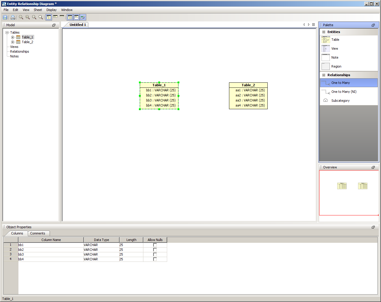 There are five methods of creating relationships or categories in the ER Modeler. 1. Right clicking within a sheet on a table and choosing New Relationship or New Subcategory from the menu. This begins a reltionship with the table where the click occurs. The Relationship Properties window appears to enter the table information. The relationship properties vary based on the database vendor and version selected when the ER model document was created. 2. Right clicking within an empty area in a sheet, then choosing New Relationship or New Subcategory from the menu. The Relationship Properties window appears allowing selection of two tables already in the sheet. 3. Right clicking on the Table node within the Model Node Browser and choosing New Relationship or New Subcategory. This creates a relationship beginning with that table. 4. Left clicking in the Palette on one of the Relationship Entity or New Subcategory icons (One to Many, One to Many NI or Subcategory) and then left clicking on two Table Entity icons within a sheet. This forms a relationship between the two clicked tables. 5. Within the Menu Bar, selecting Edit ->New Relationship or Edit->New Subcategory. This launches the relationship properties window and allows selection of two tables from within the current document. New Relationship Properties When the New Relationship Properties window is launched, the relationship requires a name and that two tables be selected. One to Many Relationships are indicated by solid lines. One to Many (NI) Non Identifying Relationships are indicated by dashed lines. The Cardinality, Type, Nulls, Parent and Child Tables for the relationship are set here and alter how the relationship appears in the diagram. The Comments tab provides an area for filling in comments for use in DDL creation, and the SQL Preview tab displays what SQL scripts will be generated if the ER Model were to be saved as an SQL script through the "Generate Script" menu under Tools within the menu bar. New Subcategory Properties When Subcategory is selected from the Entity Palette, a One to Many Relationship is created and forces the primary key of the parent table selected on the left to be inherited by the child table selected on the right. Subcategories are indicated by dotted lines with a half circle in the middle of the dotted line. Inclusive subcategories are indicated by an empty half circle and Exclusive subcategories are indicated by a crossed half circle. The Comments tab provides an area for filling in comments for use in DDL creation, and the SQL Preview tab displays what SQL scripts will be generated if the ER Model were to be saved as an SQL script through the "Generate Script" menu under Tools within the menu bar. Altering Relationship Paths Aqua Data Studio allows altering the route a relationship takes in an ER diagram to connect two tables to assist in creating readable models. A single click selects a relationship path, highlighting it and its path handles. Grabbing a path handle allows the path to be pulled into a new position. The endpoints of the path can be shifted by grabbing the handle closest to a table and sliding it along the table edges. Paths automatically reroute when tables in relationships are moved. Right clicking on a relationship also allows straightening its line with the selection of Straighten Line. Sample Relationship and Subcategory in a Model The screenshot labled "Sample Relationship and Subcatetory in a Model" shows two tables with a relationship and a subcategory for a DB2 iSeries database. The relationship is named "re1" and the subcategory is named "cat1". Relationships in the Model Node Browser appear as L shaped lines with nodes at either end. Subcategories in the Model Node Browser appear as half-circles. The table entity nodes are expanded to show the relationship and subcategory. The relationships node at the bottom of the Entity Node Brower is expanded to show the relationship and subcategory. |