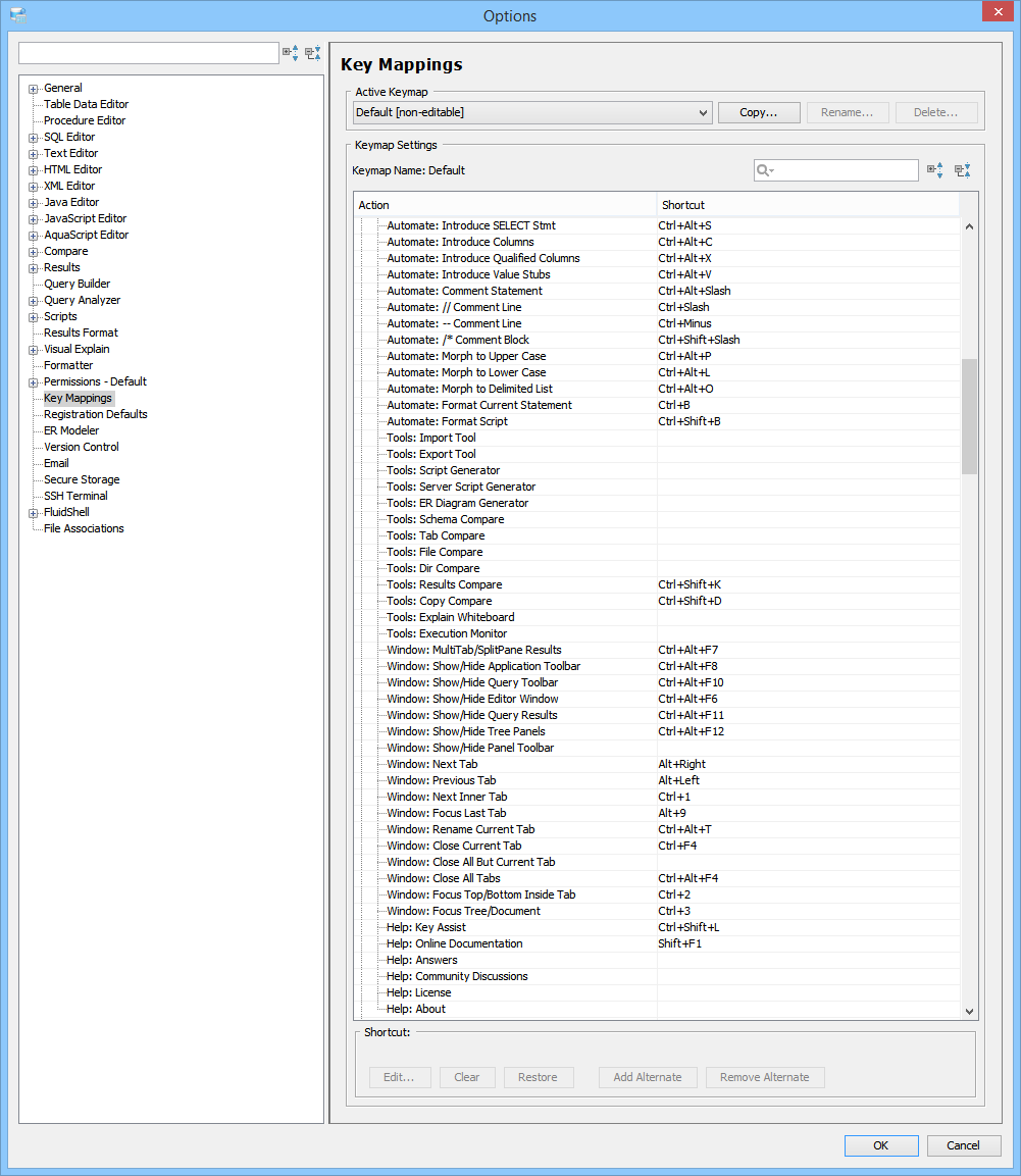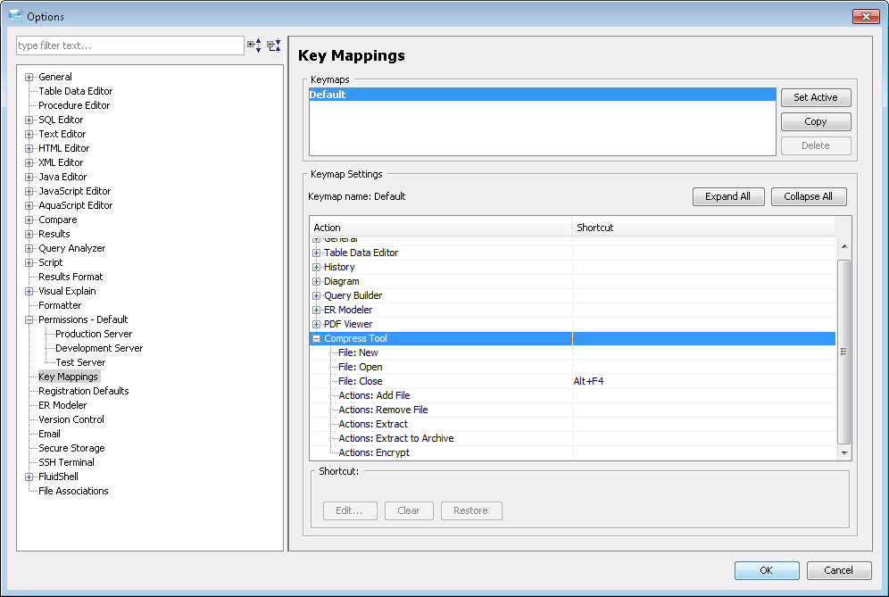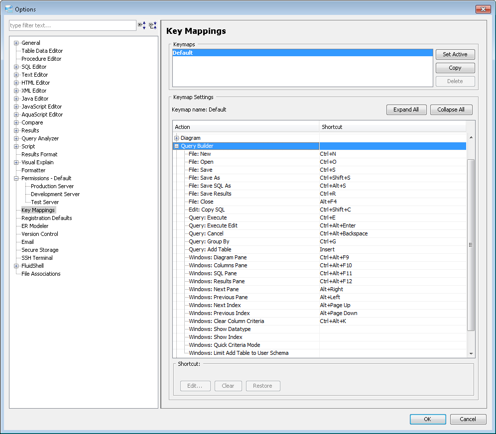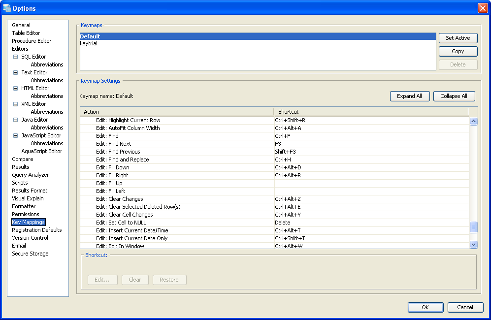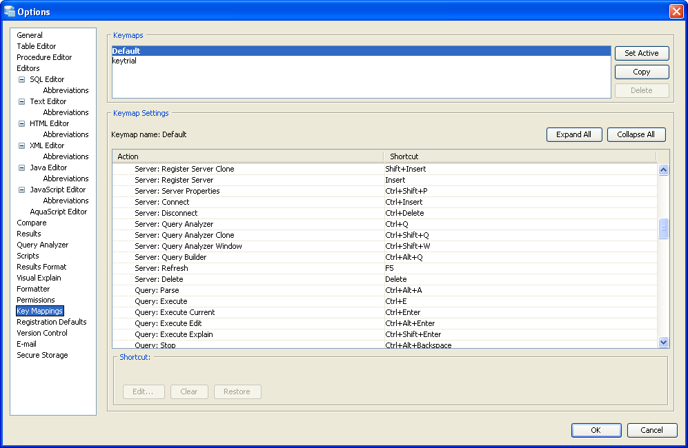 Key Mapping Options Key Mappings - The Key Mapping Options allows you to configure new key mapping profiles with new key bindings. This allows you to configure any keystroke to any action. The Key Mapping Options allow creating custom keymaps by copying existing keymaps, then configuring individual shortcut key bindings within a custom keymap. All custom keymaps may be edited, renamed and deleted. It is possible to add alternate keybinding shortcuts within a custom keymap for the same action. There are two built-in keymaps which cannot be renamed, edited or deleted, but may be copied as the foundation for new custom keymaps: