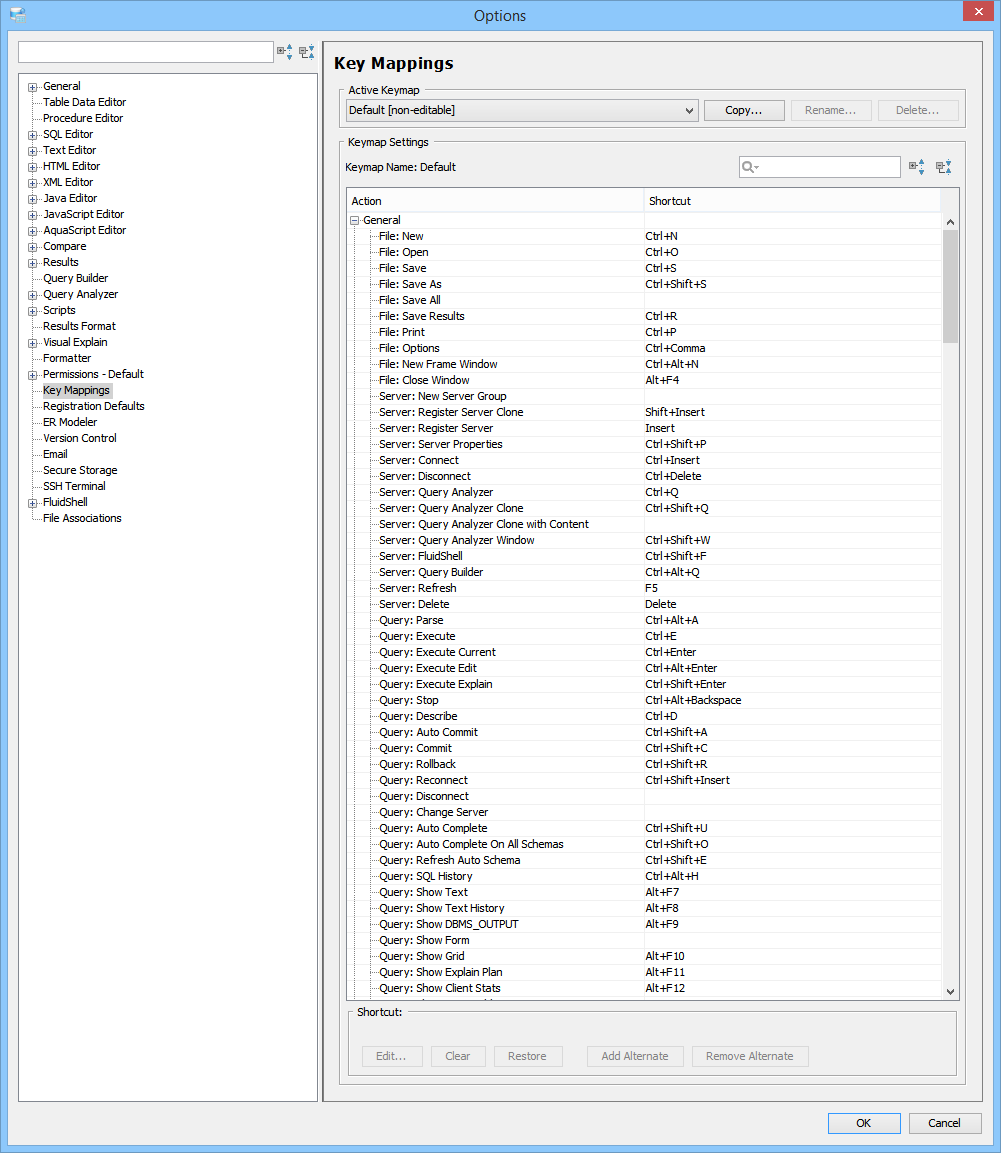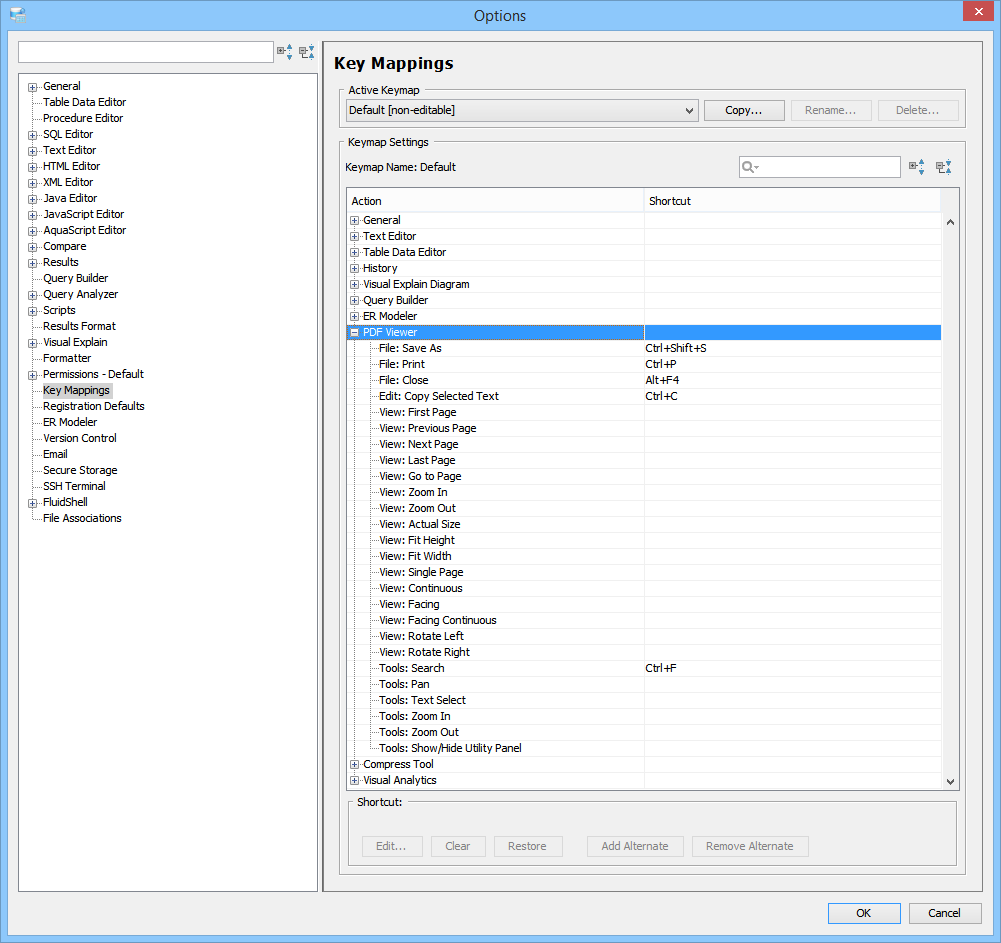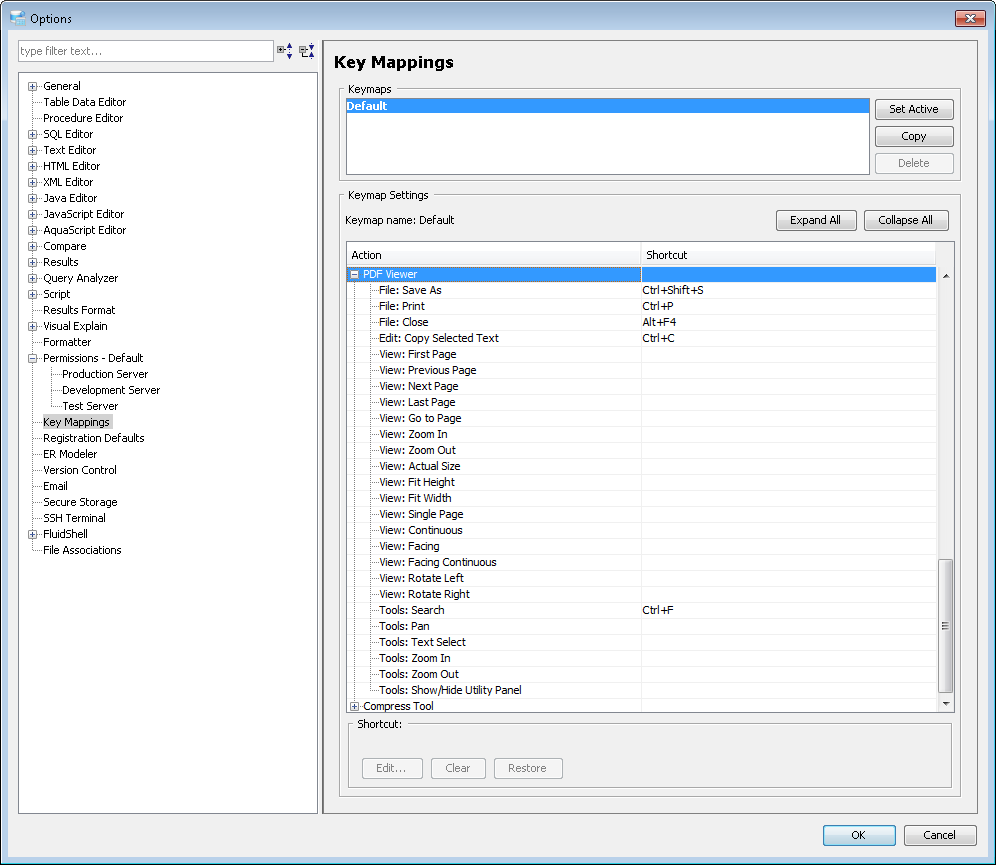 Key Mapping Options Key Mappings - The Key Mapping Options allows you to configure new key mapping profiles with new key bindings. This allows you to configure any keystroke to any action. The Key Mapping Options allow creating custom keymaps by copying existing keymaps, then configuring individual shortcut key bindings within a custom keymap. All custom keymaps may be edited, renamed and deleted. It is possible to add alternate keybinding shortcuts within a custom keymap for the same action. There are two built-in keymaps which cannot be renamed, edited or deleted, but may be copied as the foundation for new custom keymaps: