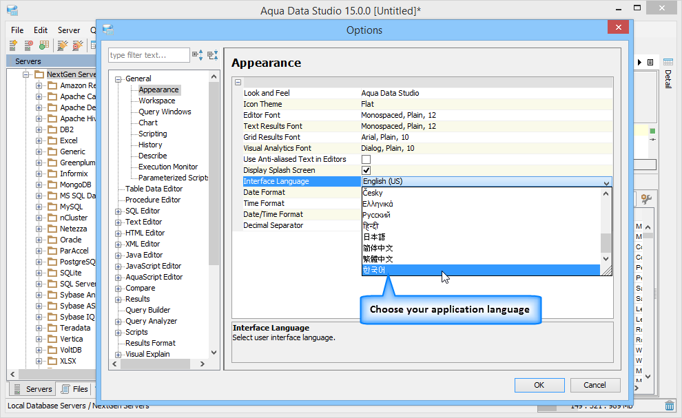 Aqua Data Studio supports the world's 21 most widely spoken languages, which include English, Polish, Norwegian, Dutch, Swedish, Czech, Danish, Finnish, Greek, Hindi, Spanish, French, Portuguese, Portuguese (Brazil), Italian, German, Russian, Korean, Chinese (Traditional), Chinese (Simplified) and Japanese.