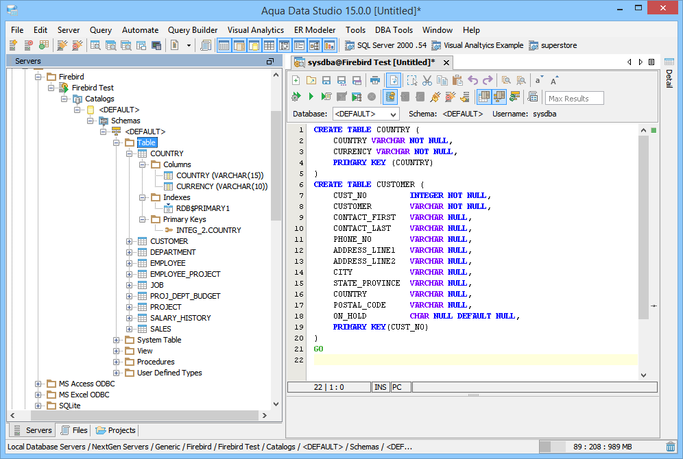 jdbc:firebirdsql:localhost/3050:C:\\pathtodatabase\\SampleDB.FDB where SampleDB is the Firebird database you want to Connect to (only windows user require paths to be formatted with escaped \, like C:\\pathtodatabase\\SampleDB.FDB ;while Linux and OSX would use /pathtodatabase/SampleDB.FDB) org.firebirdsql.jdbc.FBDriver in the Driver fieldThe Firebird Database server is registered successfully in Aqua Data Studio. You can now connect to the newly registered Server and perform Data Manipulations