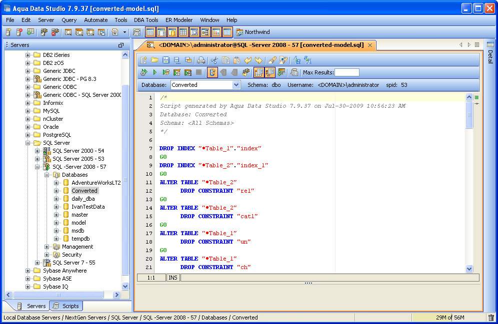ER Models within Aqua Data Studio can be converted from any database version and type to any other database version and type. If there is a DB2 iSeries database that needs to be converted to a Microsoft SQL Server 2008 database, the Tools->Convert menu within the ER Modeler can be launched to begin the conversion process. It is possible to reverse engineer a database from DB2 iSeries into an ER Model, convert the ER Model to Microsoft SQL Server 2008 and then generate the DDL for Microsoft SQL Server 2008 to create a new database structure. Through the Tools->Convert menu, the ER Model Conversion tool allows migration from one database type to another. Migrating from a model from one database type to another involves three steps. 1. Select the ER Model and convert it to the proper database target: Open an ER Model. Select Tools->Convert Model. Select the Database Type and Database Version to convert to, and press "OK". 2. Generate the DDL (Forward Engineering) needed for creating the database from the ER Model: The recently converted model opens immediately in a new ER Modeler window. Select Tools->Generate Script from the menu bar. Select the desired objects and objects types. Select the scripts options and destination for the file (or view it in the preview tab). 3. Run the Generated DDL script on the destination server within the Query Analyzer: Once the DDL script is completed, launch a query analyzer from the Main Application Menu Bar while using the appropriate connection. The target database must exist before the script is executed. A database can be created with commands in the Query Analyzer or through a right click in the Schema Browser on the appropriate server connection. For more on creating databases using Aqua Data Studio's GUI Tools in the Schema Browser, see "Creating Databases." Run the script in the Query Analyzer by dragging it into the window, or selecting "Open File" from the Query Analyzer Toolbar. Execute the script. The database structure will be created based on the generated script from the ER Model.