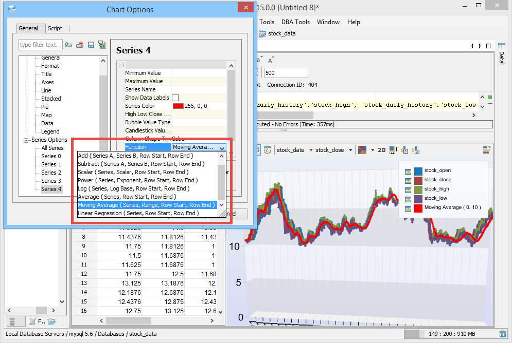 The Charting tools in Aqua Data Studio are for Business Analysts and Developers who want to analyse trends in stocks or get a dynamic view of data. The features include support for Candlestick, High Low Close, Bubble, Scatter, Surface, Stacked, Area, Pie, Bar, Column, Line and Map Charts. The Function Series introduced in Aqua Data Studio are a special series that makes use of other data series for their data values. You can select any of the function series to be combined with the standard chart types already available in ADS. It also includes support for 2D and 3D coordinate systems. Advanced options to Merge Series and Scripting charts for reuse are also available. Features of Charting Tools