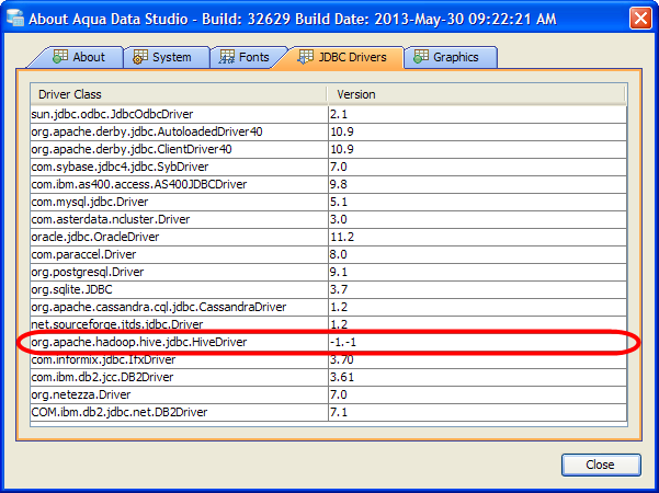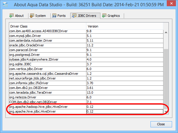 Because the Apache Hive drivers are loaded dynamically, you must connect at least once to your distribution to see what version is listed within the About Aqua Data Studio > JDBC Drivers dialog.