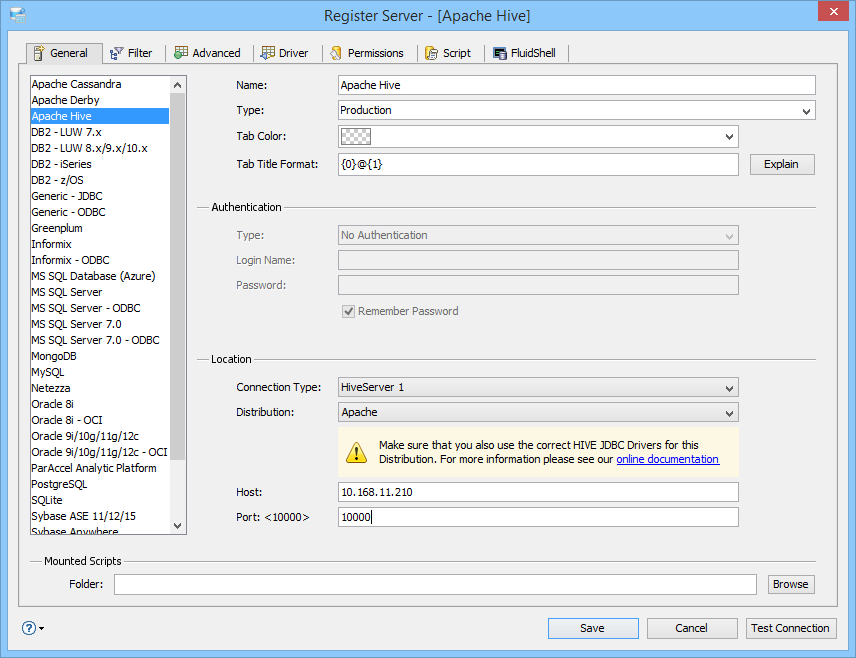 If you need to connect to Mapr, Hortonworks or Cloudera distributions of Hive, you must remove the Apache Hive JDBC Drivers that come preinstalled in <ADS_INSTALL>/lib/drivers. Replace them with drivers from your distribution before you choose a new distribution type in the Distribution dropdown within the General Tab. Follow the steps to connect to Hortonworks, Cloudera or Mapr Distributions of Hive on the Apache Hive JDBC Drivers page.