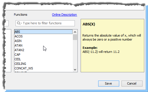 Functions available in the Functions Pane within the Calculated Field Editor are Numeric, Trigonometric or String.