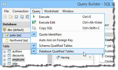 The Query Builder allows creating Multi-Database Queries for those database vendors who support them (MySQL, MS SQL Server, Sybase ASE, Teradata). Multi-Database Queries are possible for the databases within a single registered server, not across different registered servers available in the Schema Browser.