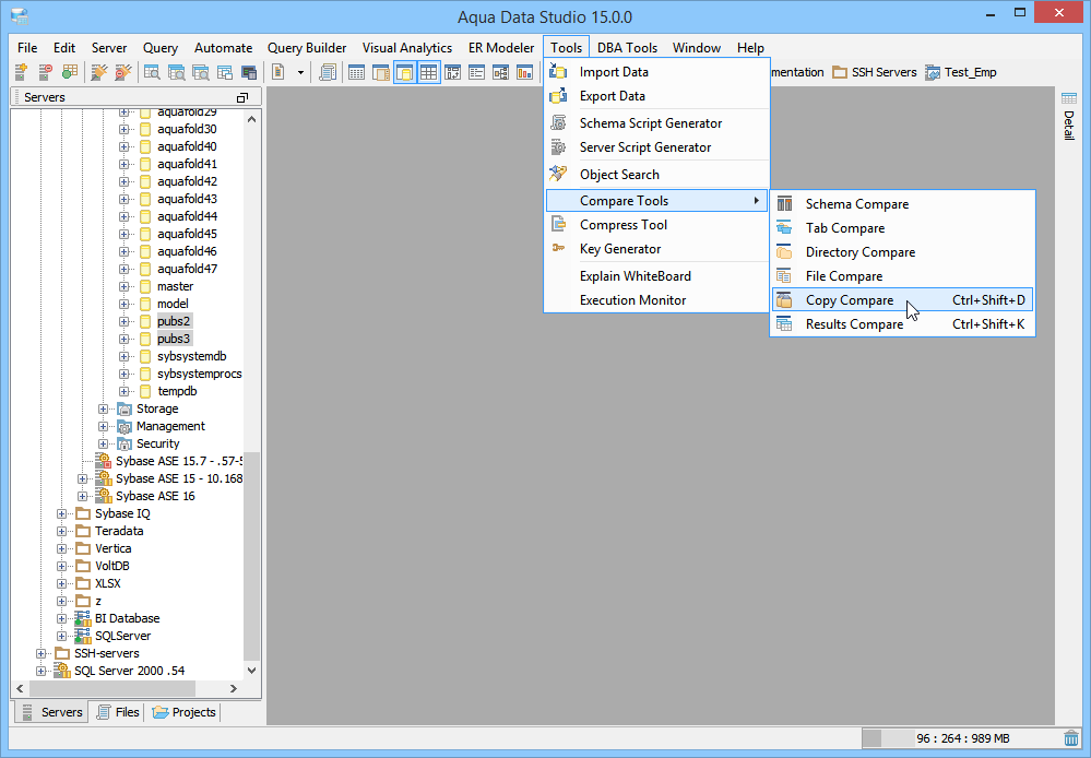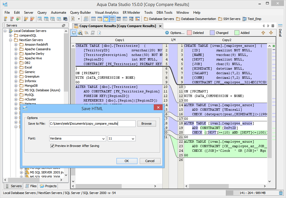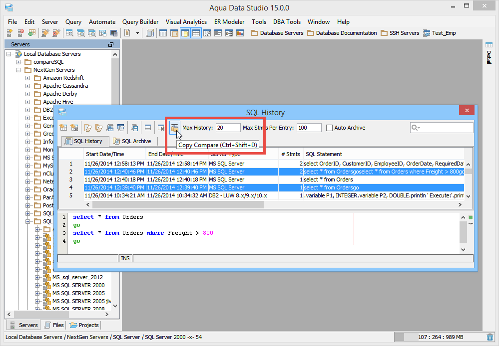Launching the Copy History Compare Tool The Copy Compare Tool provides users a method of depicting differences in the content of the clipboard history. To compare two items copied to the clipboard history, launch the Copy Compare Tool from Tools Menu (Tools->Compare->Copy Compare) and choose two items out of the list in the top panel. The lower panel displays the full contents of the selected item from the copy clipboard. It is possible to launch the Copy History Compare Tool from within the SQL History and SQL Archive tool. This allows comparison of the contents of queries stored in the SQL History and SQL Archive. Select two items with CTRL + click enables the comparison with the button to the left of the "Max History". When the comparison is being performed it runs in a background thread so that other operations in Aqua Data Studio can be performed. Comparison Results The results of a comparison display as a split-pane with line numbering down the center and connecting splines for identifying where the deletions, changes and additions occur. Each clipboard history item in a comparison takes up half of the comparison results window and each can be vertically scrolled independently of the other. At the top, between the two clipboard history items above the line numbering, digits separated by a / indicate the change selected out of total number of changes discovered (i.e. 9/27). The large up and down arrows at the top of the comparison results allow navigating through the differences one at a time. Comparisons show the character differences in a modified line with bolding and background color highlights indicate modified blocks. If they are not identical they are highlighted by default in pink (deleted), purple (changed) or green (added). The colors for the difference highlighting can be changed with the Options button at the top right of the comparison results. At the top left of the comparison results is a search button, useful for quickly finding and highlighting content in the comparison results. Annotation Bar The annotation bar provides a bird's eye view of all of the differences detected in a comparison. When differences are found, their corresponding highlight colors appear in the annotation bar on the right side of the results and can be used to quickly navigate to them. If a marker in the annotation bar is used to navigate to a particular difference by left clicking, a tick mark overlay shows which difference currently has focus. Saving Comparison Results as HTML The results of a comparison can be saved as HTML for viewing later or for sharing with others. The "Save As HTML" button at the top left of the comparison window prompts for file destination and font selection. If the "Preview in Browser" icon is clicked the user is prompted to first "Save as HTML" for launching a web browser. If the comparison has already been saved as HTML, clicking "Preview in Browser" launches a browser with the stored HTML. |