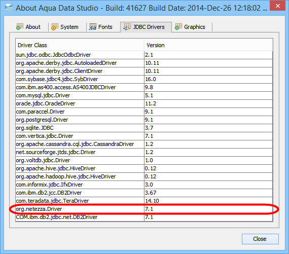 To update the Aqua Data Studio JDBC drivers for Netezza you need to overwrite the Aqua Data Studio nzjdbc.jar file. Below is a listing of the Aqua Data Studio library directory [ADS_INSTALL]\lib\drivers\ ...