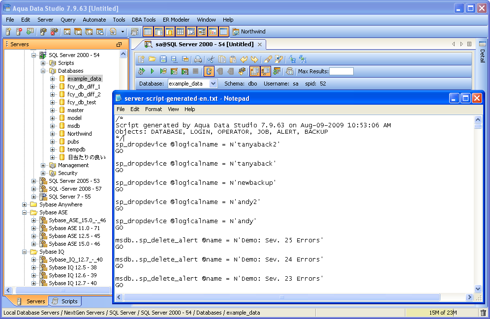 Aqua Data Studio’s Server Script Generator generates SQL Scripts for Server Objects in a database by producing a single script file of all contained server objects or individual server script files per object. Server Scripts are used for database management of backups, alerts, logins, users, roles, profiles, tablespaces and other server-based objects. The server objects available for scripting vary depending on database vendor and version. The Server Script Generator differs from the Schema Script Generator in that Server Scripts are for database management, while Schema Scripts are for schema objects such as tables and procedures. The Server Script Generator can generate syntax highlighted scripts in a preview window for copy and paste. The steps to Generate Server Scripts are described below. 1. Launch the Server Script Generator dialog by Selecting Tools->Server Script Generator from the Menu Bar, or selecting Tools->Script Generator from the right-click pop-up menu on a database in the Schema Browser. 2. In the General Tab, select a Database and pick its Server Objects. In the left panel, select one or more types of objects to be scripted. Click the green check button to select all, the red X button to de-select all, or the red/green button to revert the current selection. All objects matching the selected types will appear in the right panel. Select one or more objects to be scripted. The quickfilter can be used to select objects via wildcards. Click the green check button to select all, the red X button to de-select all, or the red/green button to revert the current selection. Click Next. 3. In the Options Tab specify where to save the generated script or scripts. Save as One File so that all SQL Statements will be output to a single file. Save as One File Per Object so that SQL statements will be output to one file per object, or Preview the SQL so that all the SQL statements will be output to the Preview tab for copy and paste. The directory and file name, encoding and platform of the file can be set. Select any appropriate options for: