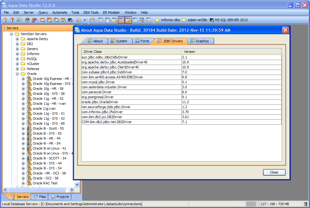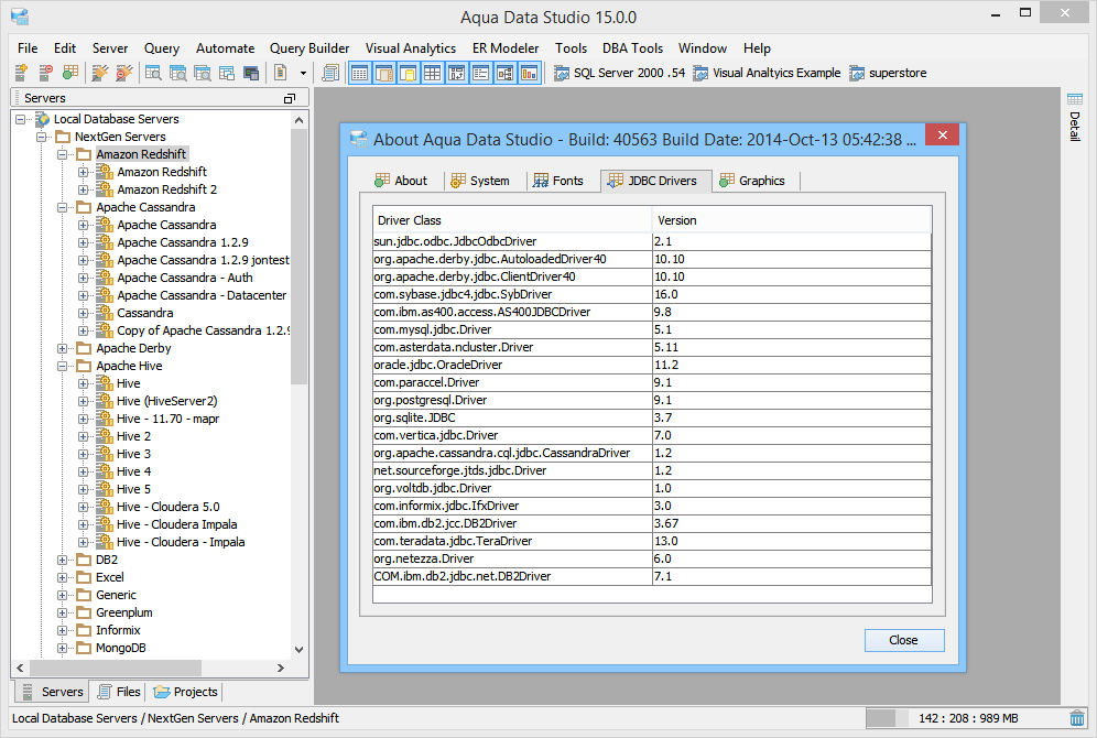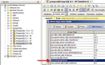Aqua Data Studio uses JDBC drivers to make database connections to the appropriate database. By default, Aqua Data Studio comes packaged with an appropriate JDBC driver for all supported databases except Teradata and DB2 z/OS (these may be downloaded directly from the vendor). The included drivers work for most database versions and setups. In specific configurations you may be required to update the JDBC driver in your Aqua Data Studio installation with the latest driver from the database vendor.