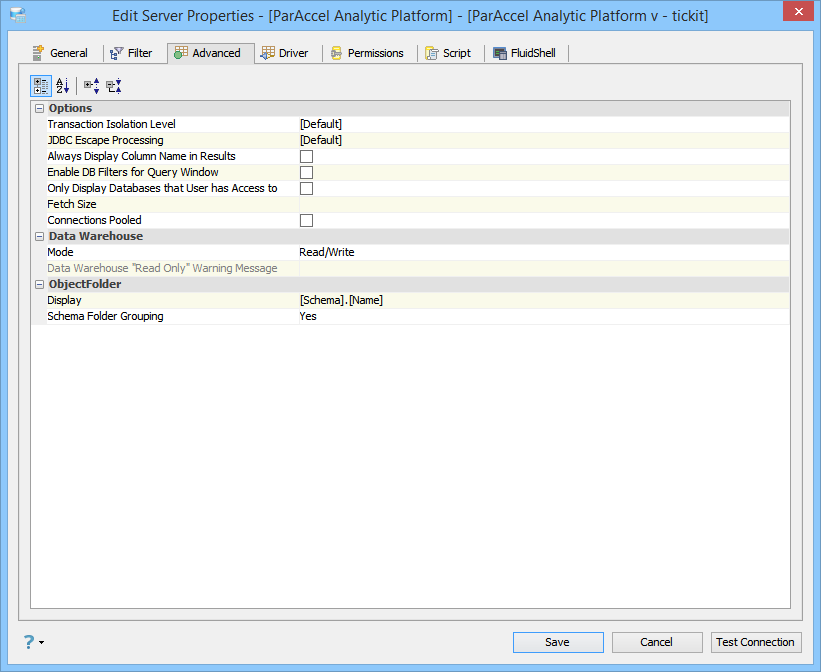 Edit the Server Properties to use Advanced Properties in Aqua Data Studio: