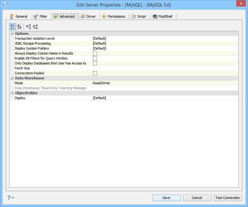 Edit the Server Properties to use Advanced Properties in Aqua Data Studio:
