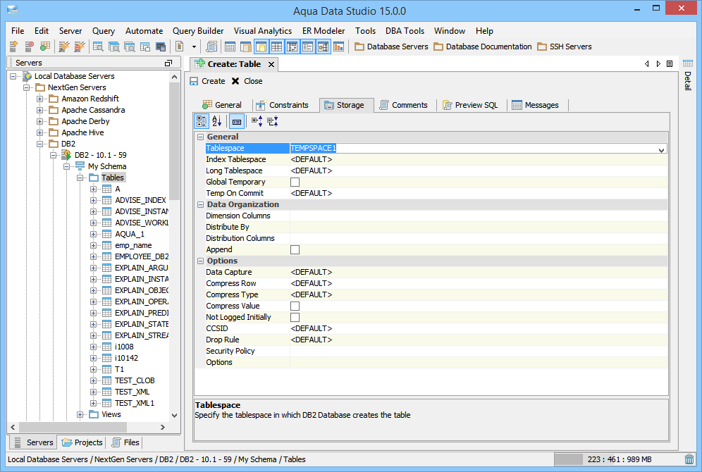 Aqua Data Studio contains GUI tools for visually editing and creating Tables. CREATE Creating tables through the GUI Tools available in the schema browser begins with opening a database server connection and expanding the tree to view the server's tables. Right clicking on the schema container for Tables generates the pop-up menu containing "Create Table" as its first item. The Create Table dialog has General, Constraints, Storage and Preview SQL tabs across the top. The General tab is where the table is named and its columns and datatypes are set. The Column information displays more details about the selected columns in the descriptin area below the column grid. INSERT and DELETE of columns is available via right click on the Column Names within the General tab of CREATE and ALTER dialogs. All of the datatypes available to the current database can be accessed with a dropdown next to the column names. The Constraints tab allows selection of columns for use in constraint creation (including Primary Key) and check conditions. Constraint properties details such as Name, Type, Ref Schema, Ref Table and Check Condition are modifiable visually. Constraint Definition Table Columns and Referenced Columns can be visually edited. For more on constraints, see the Creating Constraints page. The Storage tab provides details on Tablespace and table storage, its content vary depending on server vendor and version. The Comments tab provides space for text comments that will be stored with the table in the database. Some vendors also allow Table Column Comments, to make comments on specific columns. Where this is available, such comments will also appear ER Models containing tables with these properties. The Preview SQL tab displays the DDL used to generate the table and its properties based on the settings of the other tabs. Below are the steps used to create a table in DB2 10.1. Because other databases may not have dimensions, steps 6 and 7 may not be needed.