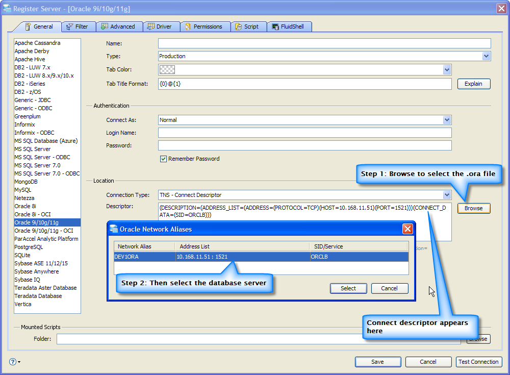 Aqua Data Studio also allows you to connect to Oracle RAC and Oracle Connection Manager by entering into the TNS Descriptor: