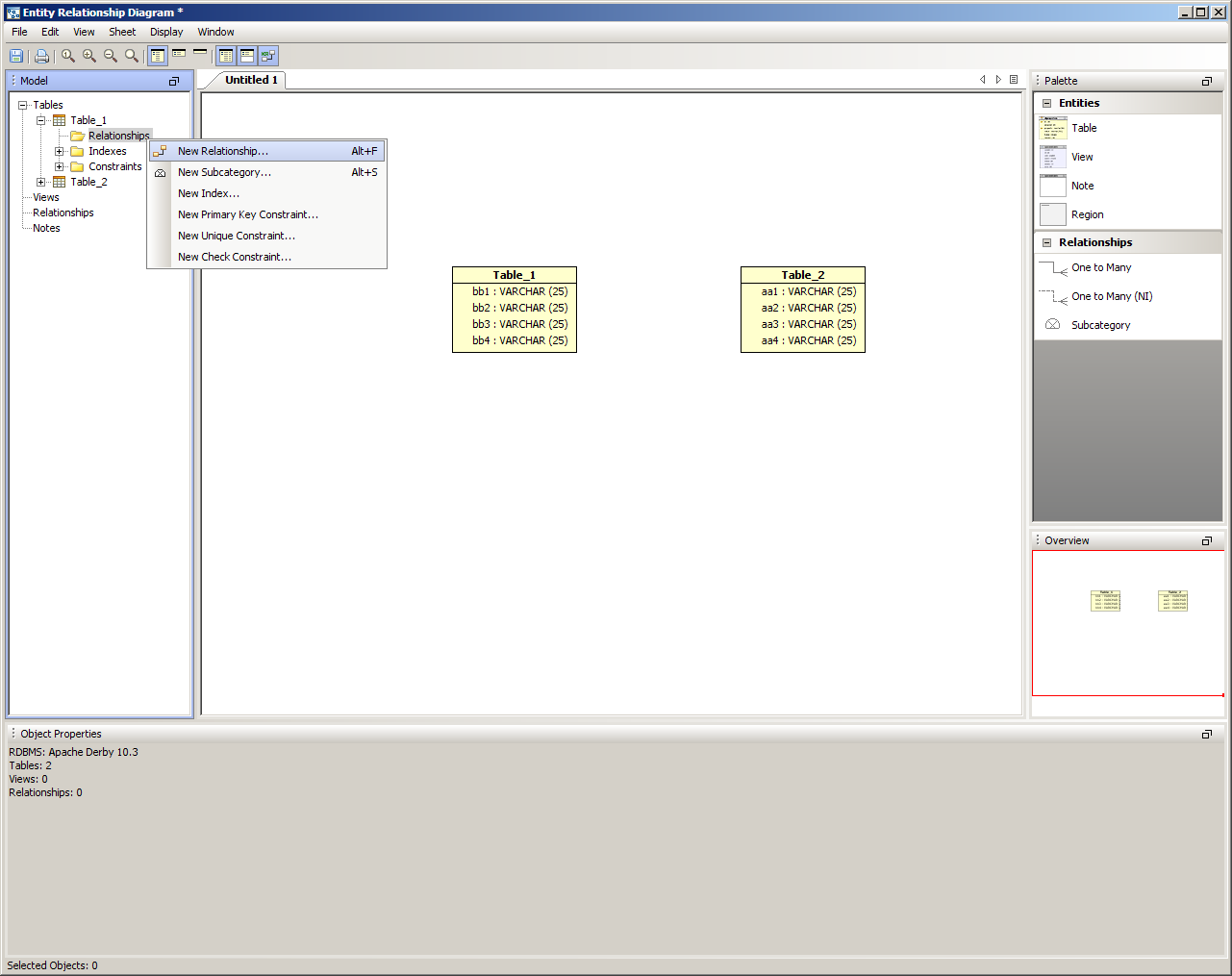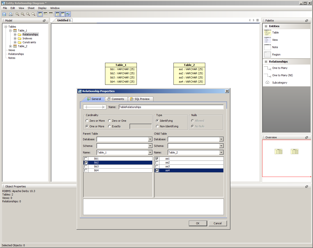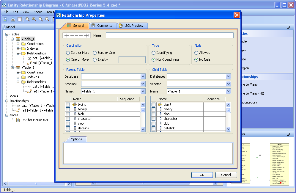 There are five methods of creating relationships or categories in the ER Modeler. 1. Right clicking within a sheet on a table and choosing New Relationship or New Subcategory from the menu. This begins a reltionship with the table where the click occurs. The Relationship Properties window appears to enter the table information. The relationship properties vary based on the database vendor and version selected when the ER model document was created. 2. Right clicking within an empty area in a sheet, then choosing New Relationship or New Subcategory from the menu. The Relationship Properties window appears allowing selection of two tables already in the sheet. 3. Right clicking on the Table node within the Model Node Browser and choosing New Relationship or New Subcategory. This creates a relationship beginning with that table. 4. Left clicking in the Palette on one of the Relationship Entity or New Subcategory icons (One to Many, One to Many NI or Subcategory) and then left clicking on two Table Entity icons within a sheet. This forms a relationship between the two clicked tables. 5. Within the Menu Bar, selecting Edit ->New Relationship or Edit->New Subcategory. This launches the relationship properties window and allows selection of two tables from within the current document. New Relationship Properties When the New Relationship Properties window is launched, the relationship requires a name and that two tables be selected. One to Many Relationships are indicated by solid lines. One to Many (NI) Non Identifying Relationships are indicated by dashed lines. The Cardinality, Type, Nulls, Parent and Child Tables for the relationship are set here and alter how the relationship appears in the diagram. The Comments tab provides an area for filling in comments for use in DDL creation, and the SQL Preview tab displays what SQL scripts will be generated if the ER Model were to be saved as an SQL script through the "Generate Script" menu under Tools within the menu bar. New Subcategory Properties When Subcategory is selected from the Entity Palette, a One to Many Relationship is created and forces the primary key of the parent table selected on the left to be inherited by the child table selected on the right. Subcategories are indicated by dotted lines with a half circle in the middle of the dotted line. Inclusive subcategories are indicated by an empty half circle and Exclusive subcategories are indicated by a crossed half circle. The Comments tab provides an area for filling in comments for use in DDL creation, and the SQL Preview tab displays what SQL scripts will be generated if the ER Model were to be saved as an SQL script through the "Generate Script" menu under Tools within the menu bar. Altering Relationship Paths Aqua Data Studio allows altering the route a relationship takes in an ER diagram to connect two tables to assist in creating readable models. A single click selects a relationship path, highlighting it and its path handles. Grabbing a path handle allows the path to be pulled into a new position. The endpoints of the path can be shifted by grabbing the handle closest to a table and sliding it along the table edges. Paths automatically reroute when tables in relationships are moved. Right clicking on a relationship also allows straightening its line with the selection of Straighten Line. Sample Relationship and Subcategory in a Model The screenshot labled "Sample Relationship and Subcatetory in a Model" shows two tables with a relationship and a subcategory for a DB2 iSeries database. The relationship is named "re1" and the subcategory is named "cat1". Relationships in the Model Node Browser appear as L shaped lines with nodes at either end. Subcategories in the Model Node Browser appear as half-circles. The table entity nodes are expanded to show the relationship and subcategory. The relationships node at the bottom of the Entity Node Brower is expanded to show the relationship and subcategory. |