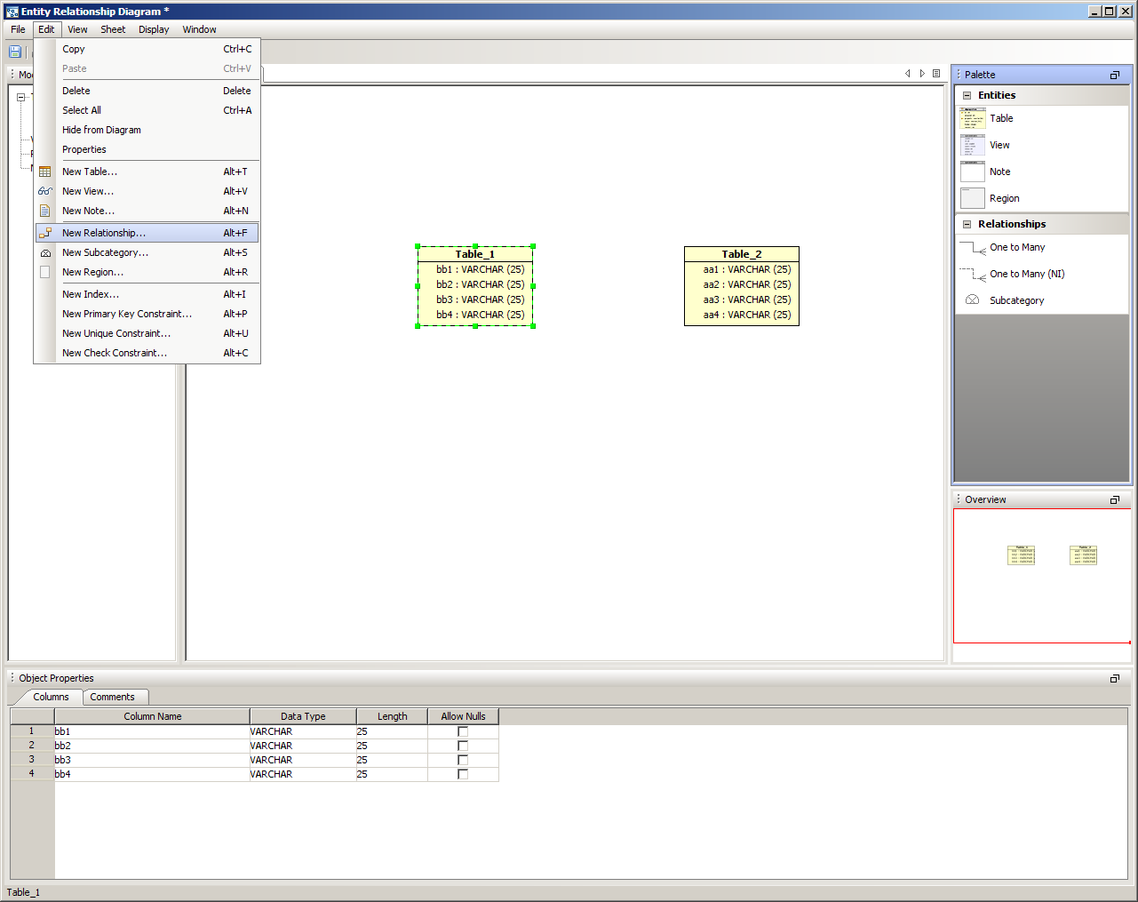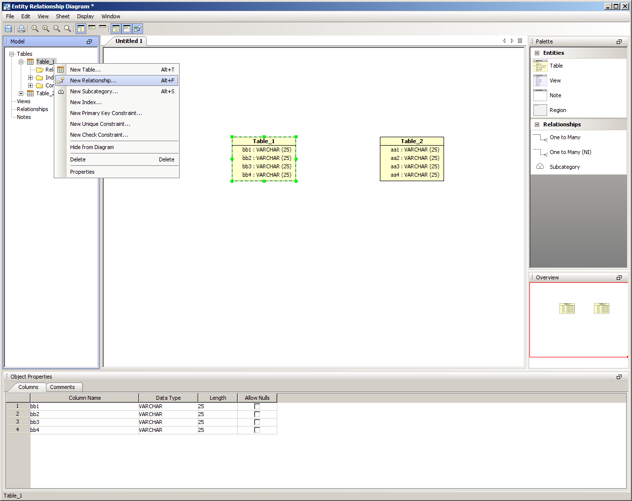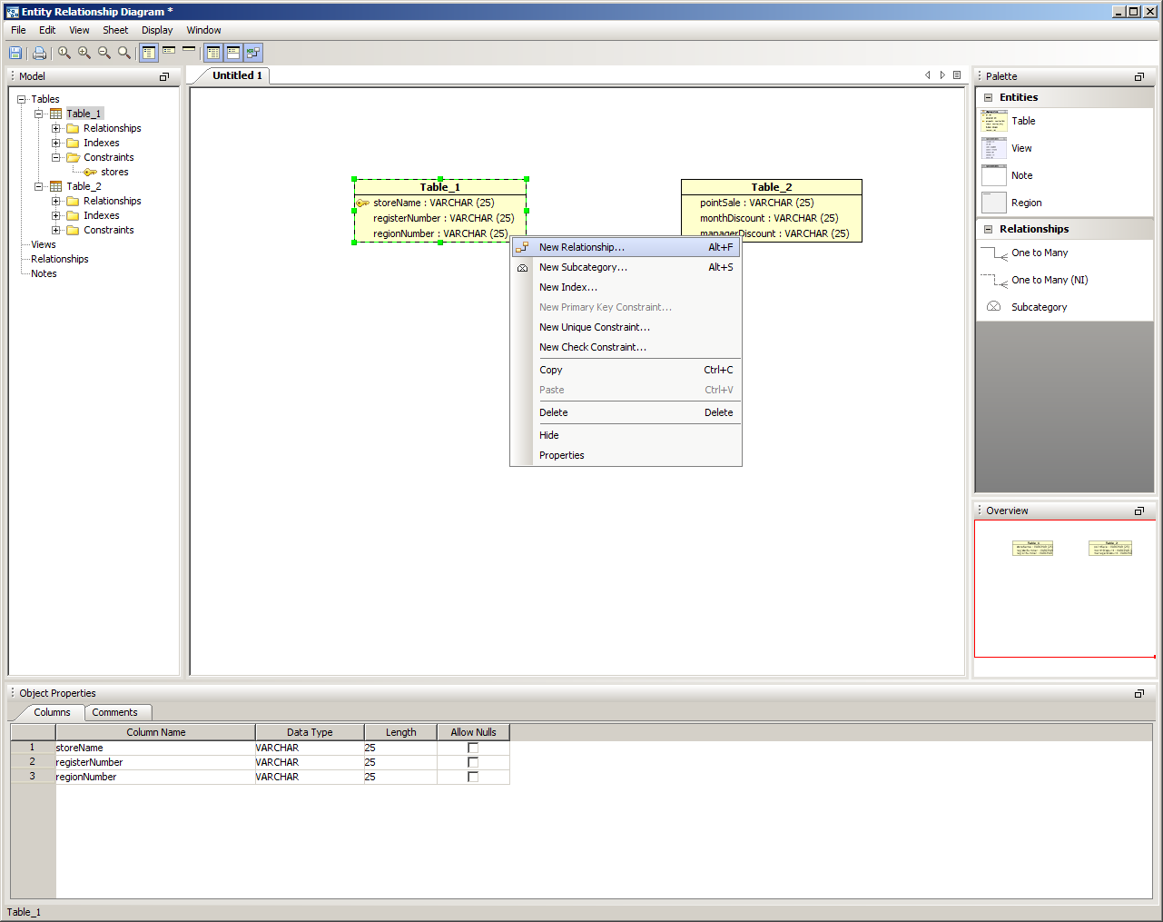 There are five methods of creating relationships or categories in the ER Modeler. 1. Right clicking within a sheet on a table and choosing New Relationship or New Subcategory from the menu. This begins a reltionship with the table where the click occurs. The Relationship Properties window appears to enter the table information. The relationship properties vary based on the database vendor and version selected when the ER model document was created. 2. Right clicking within an empty area in a sheet, then choosing New Relationship or New Subcategory from the menu. The Relationship Properties window appears allowing selection of two tables already in the sheet. 3. Right clicking on the Table node within the Model Node Browser and choosing New Relationship or New Subcategory. This creates a relationship beginning with that table. 4. Left clicking in the Palette on one of the Relationship Entity or New Subcategory icons (One to Many, One to Many NI or Subcategory) and then left clicking on two Table Entity icons within a sheet. This forms a relationship between the two clicked tables. 5. Within the Menu Bar, selecting Edit ->New Relationship or Edit->New Subcategory. This launches the relationship properties window and allows selection of two tables from within the current document. New Relationship Properties When the New Relationship Properties window is launched, the relationship requires a name and that two tables be selected. One to Many Relationships are indicated by solid lines. One to Many (NI) Non Identifying Relationships are indicated by dashed lines. The Cardinality, Type, Nulls, Parent and Child Tables for the relationship are set here and alter how the relationship appears in the diagram. The Comments tab provides an area for filling in comments for use in DDL creation, and the SQL Preview tab displays what SQL scripts will be generated if the ER Model were to be saved as an SQL script through the "Generate Script" menu under Tools within the menu bar. New Subcategory Properties When Subcategory is selected from the Entity Palette, a One to Many Relationship is created and forces the primary key of the parent table selected on the left to be inherited by the child table selected on the right. Subcategories are indicated by dotted lines with a half circle in the middle of the dotted line. Inclusive subcategories are indicated by an empty half circle and Exclusive subcategories are indicated by a crossed half circle. The Comments tab provides an area for filling in comments for use in DDL creation, and the SQL Preview tab displays what SQL scripts will be generated if the ER Model were to be saved as an SQL script through the "Generate Script" menu under Tools within the menu bar. Altering Relationship Paths Aqua Data Studio allows altering the route a relationship takes in an ER diagram to connect two tables to assist in creating readable models. A single click selects a relationship path, highlighting it and its path handles. Grabbing a path handle allows the path to be pulled into a new position. The endpoints of the path can be shifted by grabbing the handle closest to a table and sliding it along the table edges. Paths automatically reroute when tables in relationships are moved. Right clicking on a relationship also allows straightening its line with the selection of Straighten Line. Sample Relationship and Subcategory in a Model The screenshot labled "Sample Relationship and Subcatetory in a Model" shows two tables with a relationship and a subcategory for a DB2 iSeries database. The relationship is named "re1" and the subcategory is named "cat1". Relationships in the Model Node Browser appear as L shaped lines with nodes at either end. Subcategories in the Model Node Browser appear as half-circles. The table entity nodes are expanded to show the relationship and subcategory. The relationships node at the bottom of the Entity Node Brower is expanded to show the relationship and subcategory. |