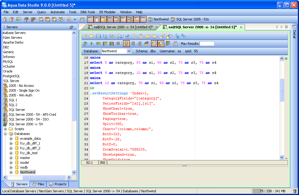 Aqua Data Studio has numerous chart types with in-depth functionality. You can enable support for charts, execute a query, generate a chart, script and share the charts with Business Analysts or Developers or any other Aqua Data Studio users. It is also possible to create AquaScripts that perform this functionality with far greater control and complexity. See the AquaScripts and AquaProjects section for more. Also see the Grid Chart and Pivot Grid information dealing with "Generate AquaScript" by right clicking on a chart. Users can re-execute the script and generate the charts with the exact properties that you have set, thus reducing development time. To Generate Chart Scripts: