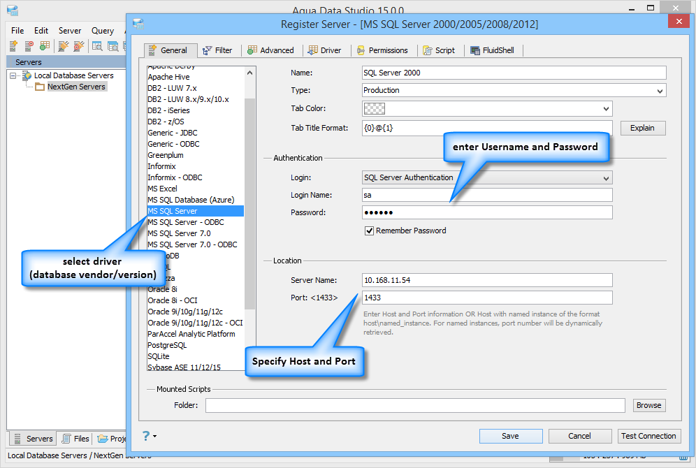 There are defaults set for the different RDBMSes within the Register Server Dialog, depending on the database vendor and version chosen. In most cases it is good to use these defaults. There is some variation in how different database types are registered and it is important to have the correct drivers. For more information on drivers see the "JDBC Drivers" section.