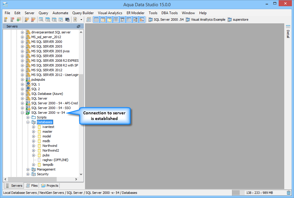 Once you have installed Aqua Data Studio you will need to register your servers before you get started. Server Registrations are created, edited, grouped, connected to and disconnected from most easily through the Schema Browser.