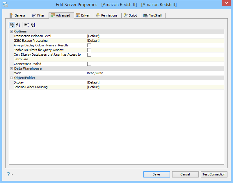 Edit the Server Properties to use Advanced Properties in Aqua Data Studio: