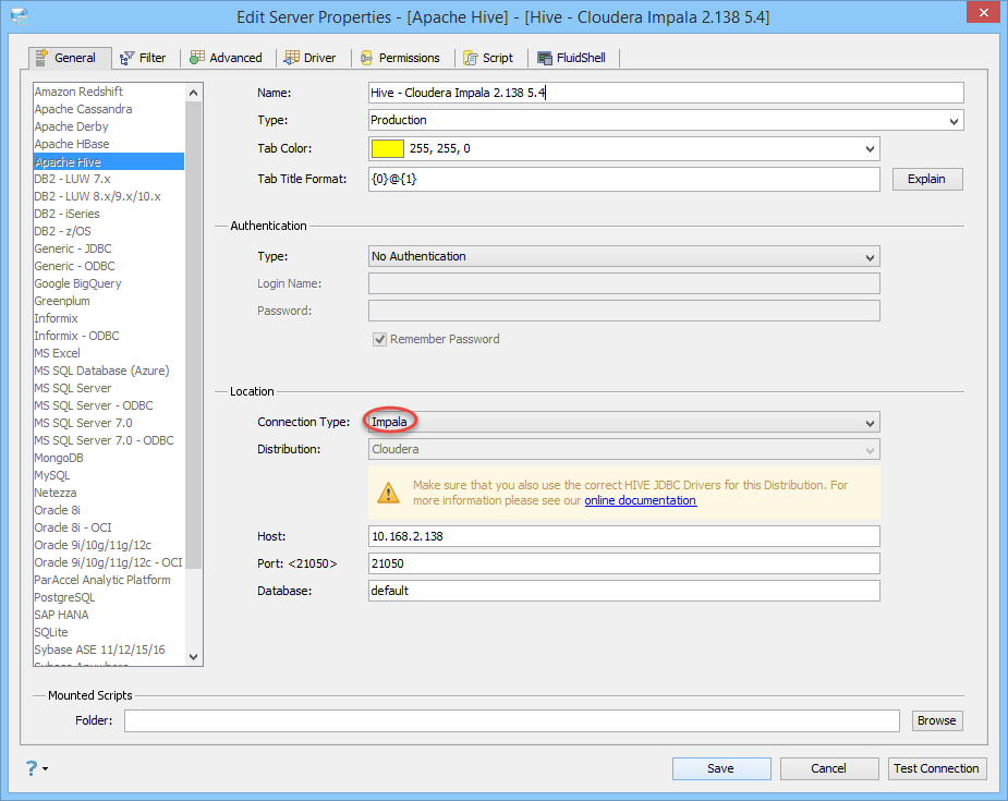 An example using a Cloudera distribution connecting to Impala with no authentication.