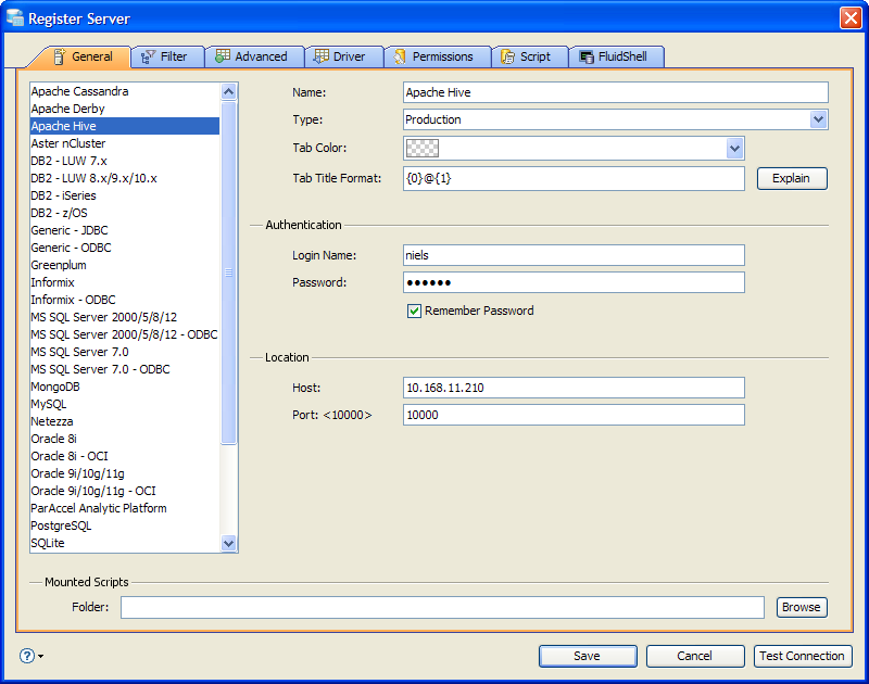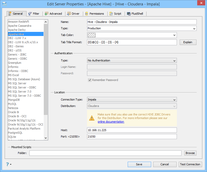 If you need to connect to Mapr, Hortonworks or Cloudera distributions of Hive, you must remove the Apache Hive JDBC Drivers that come preinstalled in <ADS_INSTALL>/lib/drivers. Replace them with drivers from your distribution before you choose a new distribution type in the Distribution dropdown within the General Tab. Follow the steps to connect to Hortonworks, Cloudera or MapR Distributions of Hive on the Apache Hive JDBC Drivers page.