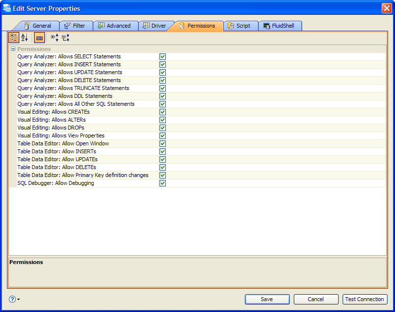 Edit the Permissions in Server Properties in Aqua Data Studio:
