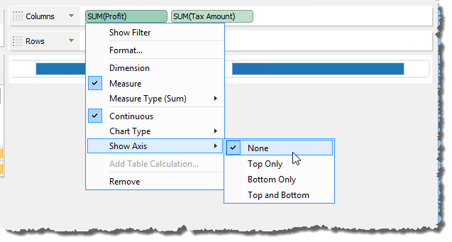 If you choose [Location] (None) and are unable to right click to generate the Edit Axis menu in the chart, you can right click on a measure in the Rows or Columns deck and use [Show Axis] to select a new display location for your hidden axes.