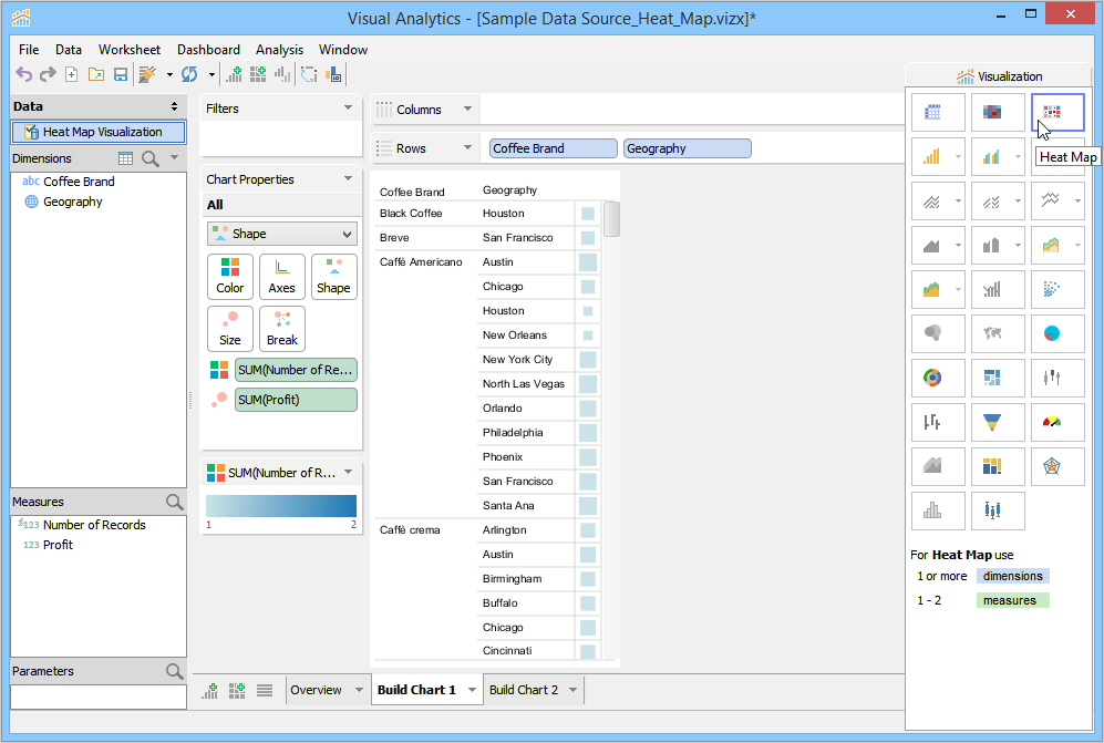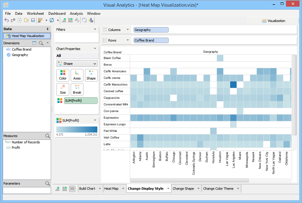 By default, Visualization moves Profit to the Color Deck and displays the profit value of coffee brands in different color intensity. The size of the square is uniform because the Size Deck is empty. Now move Profit from the Measures pane to the Size Deck. Visual Analytics displays the profit value for coffee brands in different square sizes and color intensity. Also, when Visualization built this chart, it displayed both dimensions on the Y-axis. We have changed this display by moving Geography to the Columns Deck. Now, Coffee Brand is on the Y-axis, and Geography is on the X-axis.