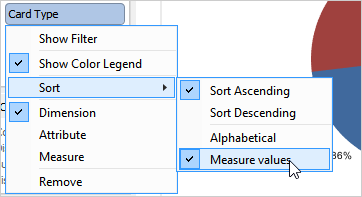 By default, Visual Analytics sorts the dimension record of the Pie Chart alphabetically in the ascending order. You can now sort the chart by measure values in the ascending or descending order.