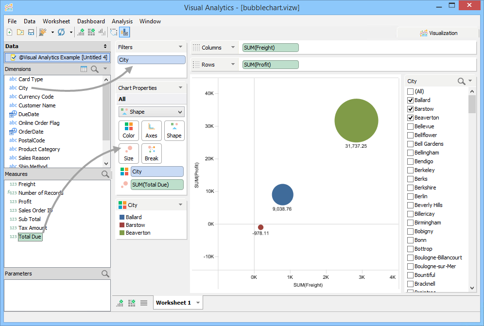 1. Drag Total Due from Measures into the [Size] button of the Chart Properties. This alters the circles so that their size represents the sum of Total Due for each City.