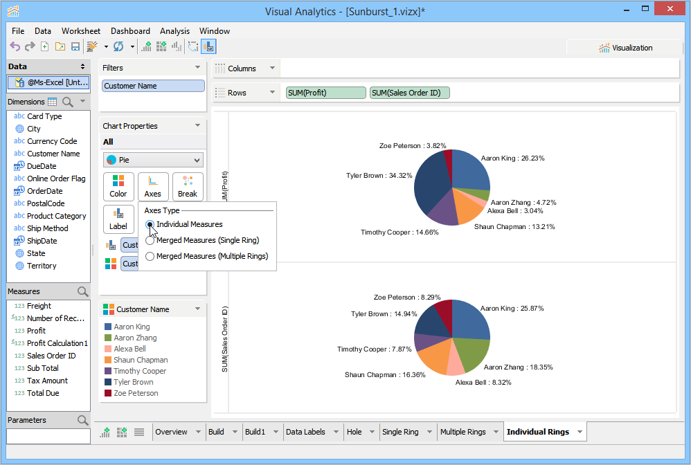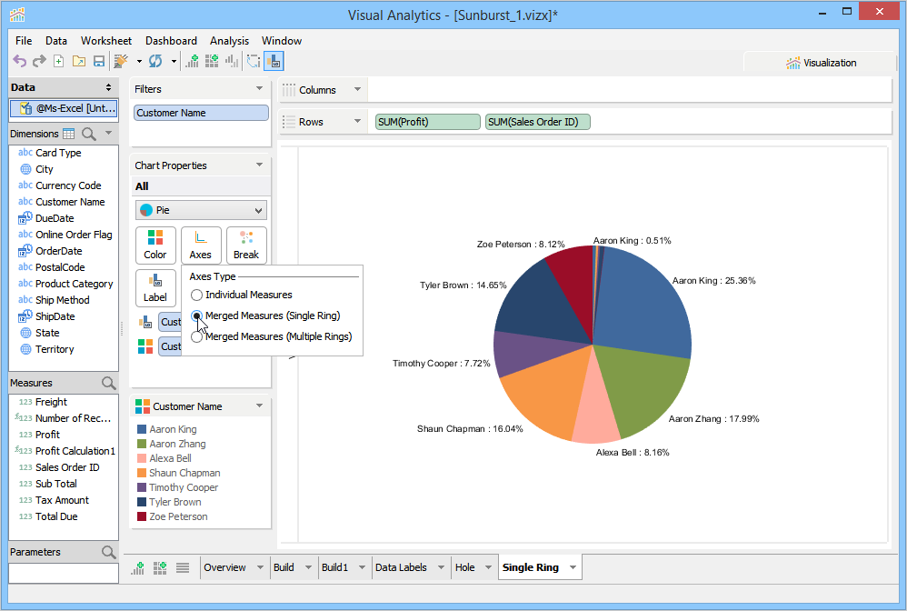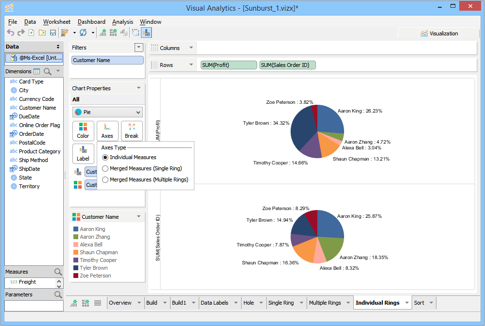 With Product Category Dimension in the Labels Deck, the product category names appear on the rings. Additionally, you can also enable the Show percentage check box and see the profit of each product category directly on the chart rings.
