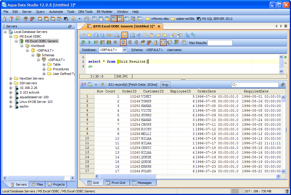 The Microsoft Excel ODBC Data Source is registered successfully in Aqua Data Studio. You can now connect to the newly registered Server and perform Data Manipulations.