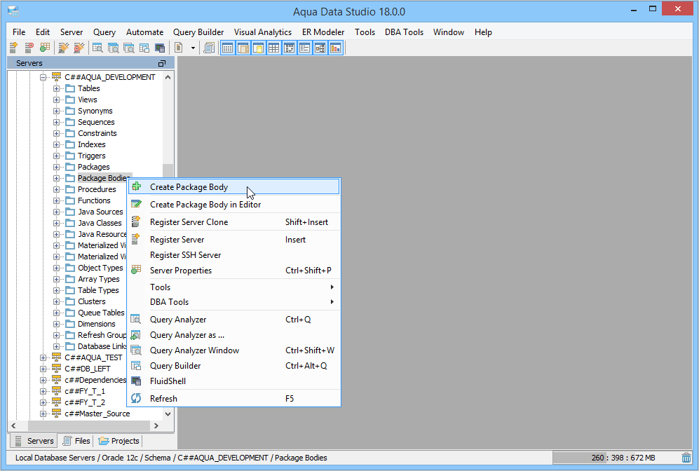 Aqua Data Studio can access and edit Procedures, Functions and Packages through the Schema Browser. Stored Procedures are subroutines stored in a database's dictionary and are often used for data validation and access control. They collect logic usually spread across several statements in complex actions for access from a single call. Functions are blocks of code to perform a series of actions used to extend the functionality of a database server. User defined functions are defined with CREATE FUNCTION in SQL statements. They can be used for converting and evaluating data or performing other actions. Packages, in Oracle, are used for encapsulating a group of functions, procedures and other program objects. Packages have specifications (definitions) and bodies. They provide containers for related items. Depending on the database version and vendor, Package, Procedure and Function debugging is also available. See the SQL Debuggers section for more. When Procedures, Functions and Packages are invalid, they are marked in the Schema Browser with a red box icon overlay. Expanding marked objects in the Schema Tree shows which specific Package contents are invalid. Options for determining if both the header and the body are both compiled when compile is executed can be set in File -> Options -> Procedure Editor.
