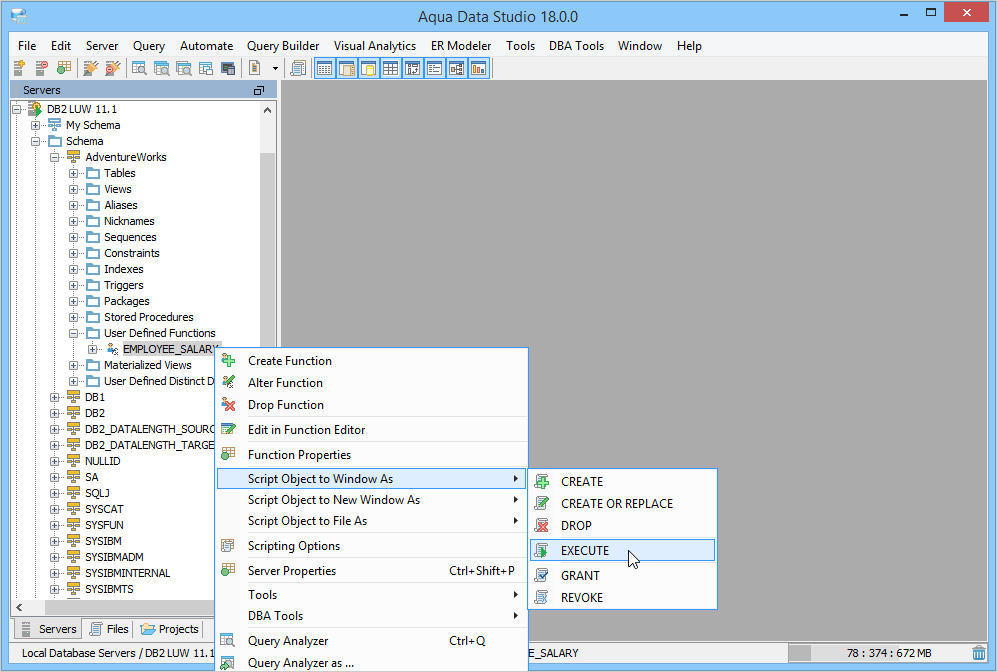 Executing DB2 USER DEFINED FUNCTION Connect to the Database Server and Open a Query Analyzer. Type the following and Execute to see the UDF result