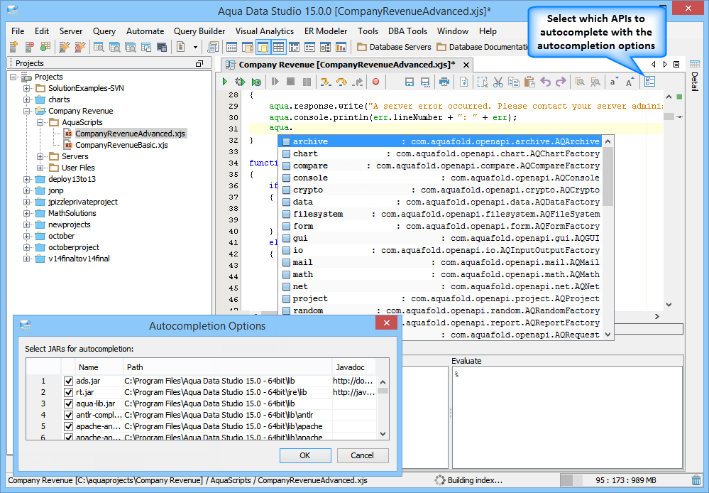 Autocompletion & Syntax Coloring: The editor has the ability to index any Java jar file to be used in autocompletion and syntax coloring. The stubs and indexes are stored in the <USER_HOME>\.datastudio\openapi folder. By default, the JVM rt.jar and the Aqua Data Studio ads.jar file are indexed. The user may choose to index other jars, such as their own proprietary libraries by selecting the options button in the editor toolbar, which allows the user to choose from a list of jars in the application class path. The indexing is done in the background and a status message is displayed in the application status bar. Once the indexing is complete, the user will have full access to the index jars for autocompletion and syntax coloring. When the application is started, if it detects that any of the index jars have changed, it will reindex the jar to synchronize the changes. The autocompletion may be triggered with a CTRL-space keystroke.