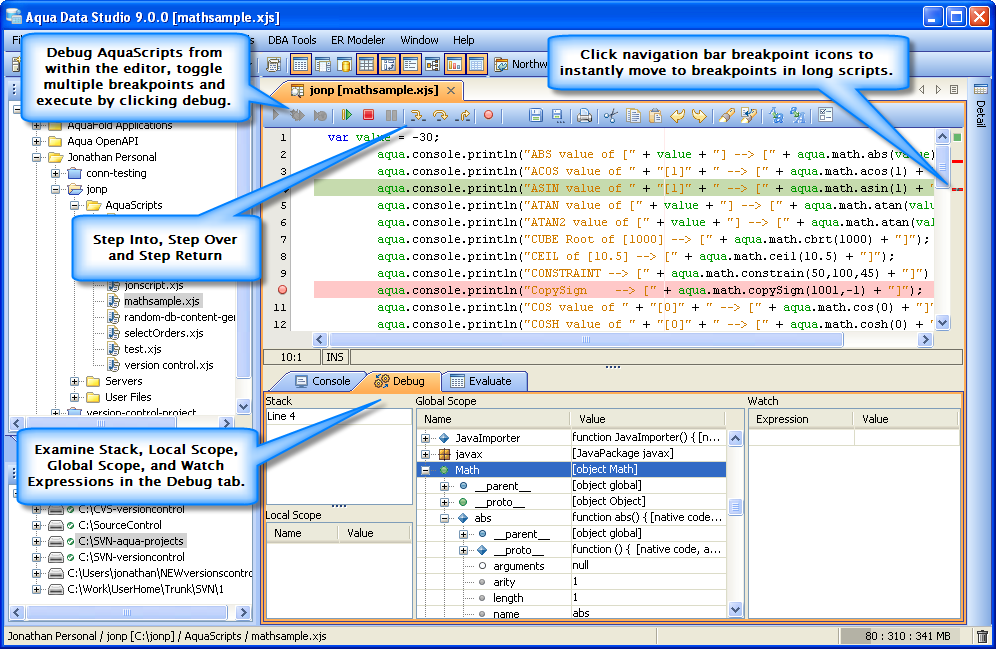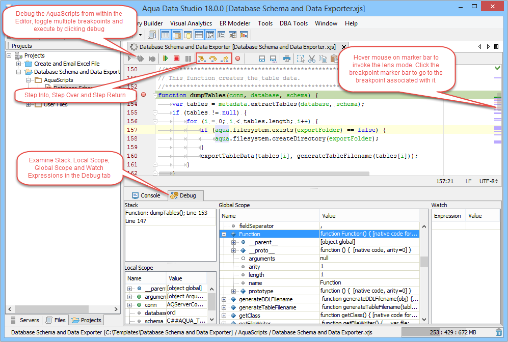 Debug AquaScripts within the Editor: Just like Aqua Data Studio's DB2, MS SQL Server, Oracle and Sybase SQL debuggers, AquaScripts can be stepped through during execution to examine results and debug errors. Functions can be evaluated and parameters entered as the debugging process continues. Breakpoints can be set and used to pause execution to examine values and parameters. The debugger highlights the breakpoints, indicates which one currently pauses the execution and sets bookmarks in the navigation bar so that they can be viewed quickly when there are multiple pages worth of lines to debug.