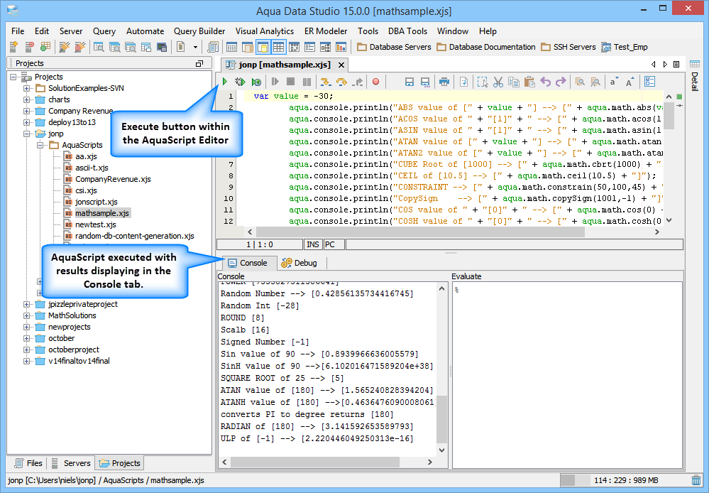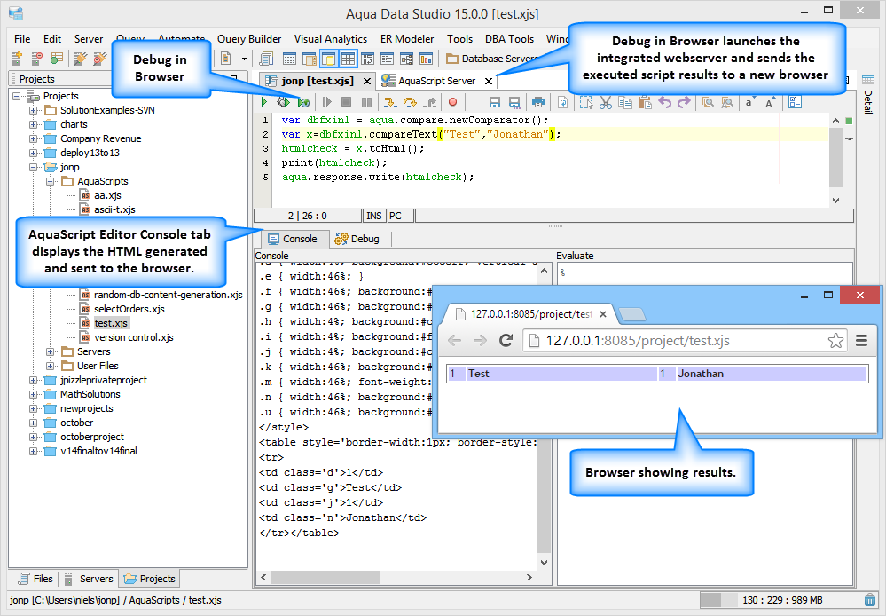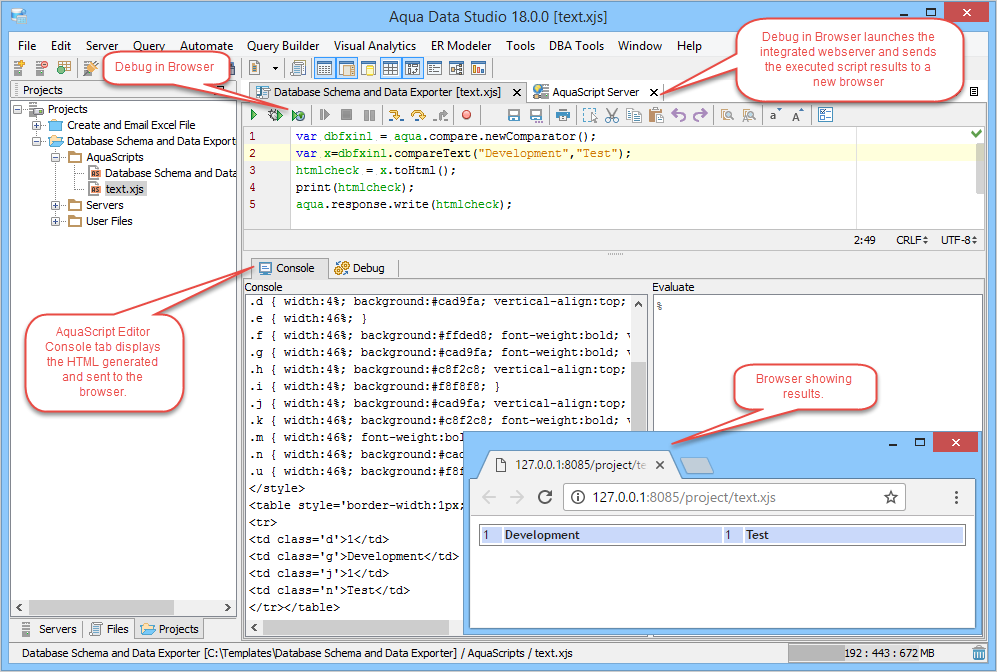 Execute Scripts in the Editor: With the AquaScript editor, you are able to execute an AquaScript in 3 different modes from the editor toolbar. The 3 modes include: Execute in console, Debug in Console and Debug in Browser. The Execute in Console allows the user to execute the script with the Console window as the primary out to the user. Debug in Console allows the user to debug a script executed in Console mode. The Debug in Browser will launch a basic webserver within Aqua Data Studio and allow a browser to request the execution of the script, in which case the script may output to the console or to the aqua.response object which will be sent to the browser for HTML rendering. The latter is to allow a user to write and debug scripts that will be deployed to Aqua Data Server as a web-based script or application.