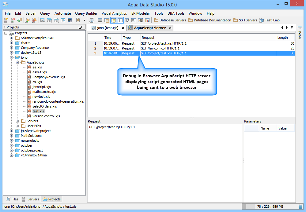 Debug AquaScripts within a Web Browser: When debugging in the browser, the built-in HTTP server will provide an interface in a tab document within ADStudio. The interface will display the HTTP requests processed. The HTTP requests include which scripts that are executed, with the parameter name value pairs that are passed to the executing script.