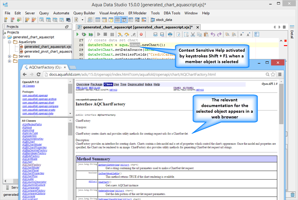 Context Sensitive Help: The editor provides context sensitive help as you write your scripts by mapping the Shift-F1 keystroke to the launching of your web browser to the API documentation of the object you are currently working on or that you have selected. The full documentation for the Open API is located at http://docs.aquafold.com/ads/18.0/openapi, and the context help will launch to this documentation with the class appended to the end. This provides instant access to the API.