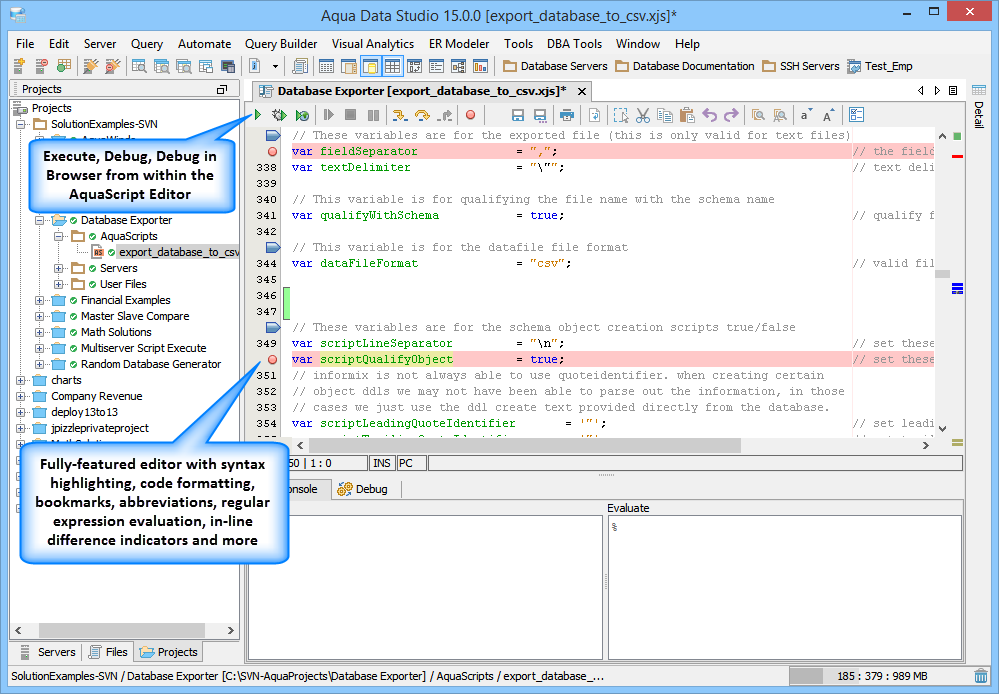 AquaScript Editor: The new AquaScript Editor is a complete and fully functional editor for the JavaScript programming language. It provides autocompletion, syntax coloring, bookmarks, abbreviations, find/replace, incremental search and more. Editing scripts for Aqua Data Studio is as simple as writing JavaScript. The fully-featured editor optimizes the script creation process. The AquaScript Editor takes its syntax highlighting cues from the JavaScript/AquaScript Editor Options.