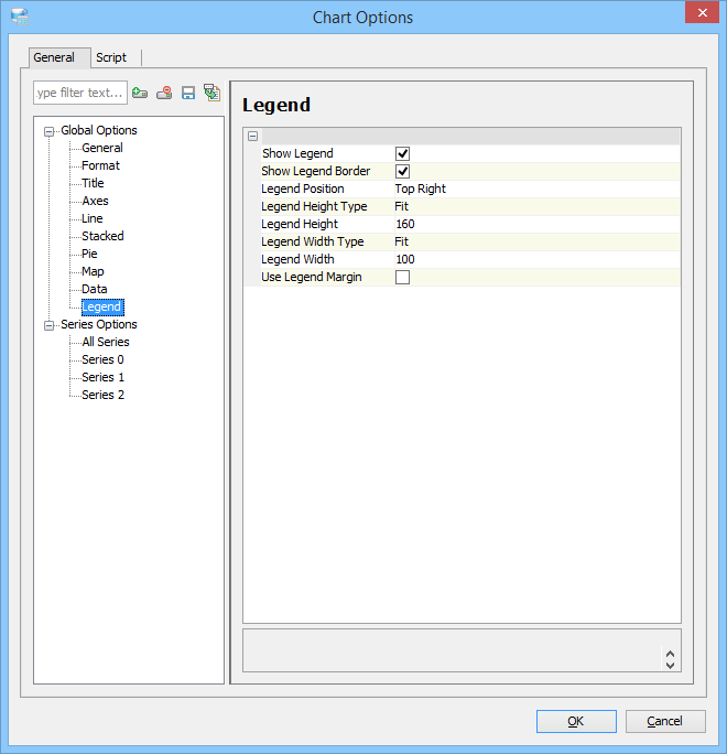 Chart Options for Aqua Data Studio contain a complete set of variables and values to alter the chart as needed, including background color, chart title, label distance, axis titles, category axis number format and much more. Series Options ( Advanced Chart Options ) information is presented at the bottom of this page. It is possible to search the chart options using the field at the top left of the Chart Options Dialog. Any matching text found in an option section ( Format, Title, Axes, etc.), option name or option description gets highlighted in the section and bolded to make it easy locate where your search term has been found.