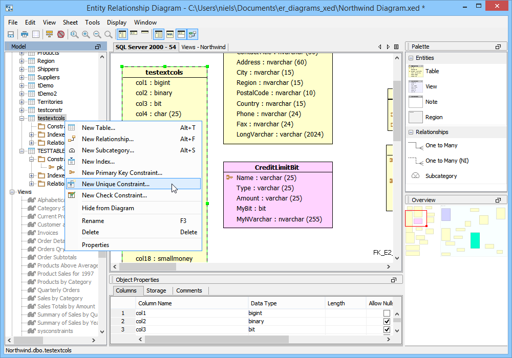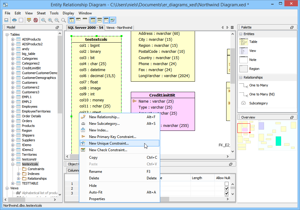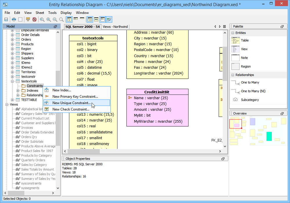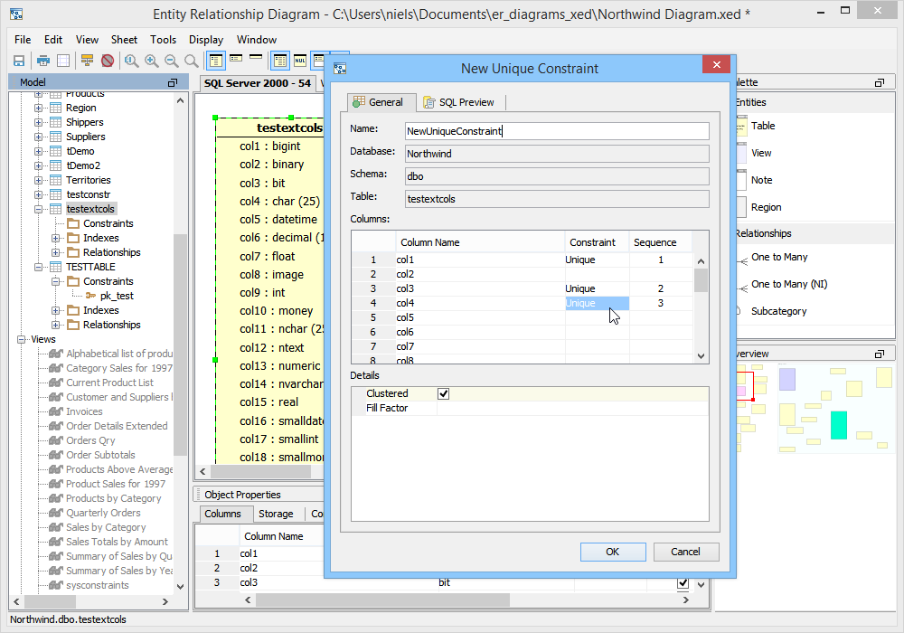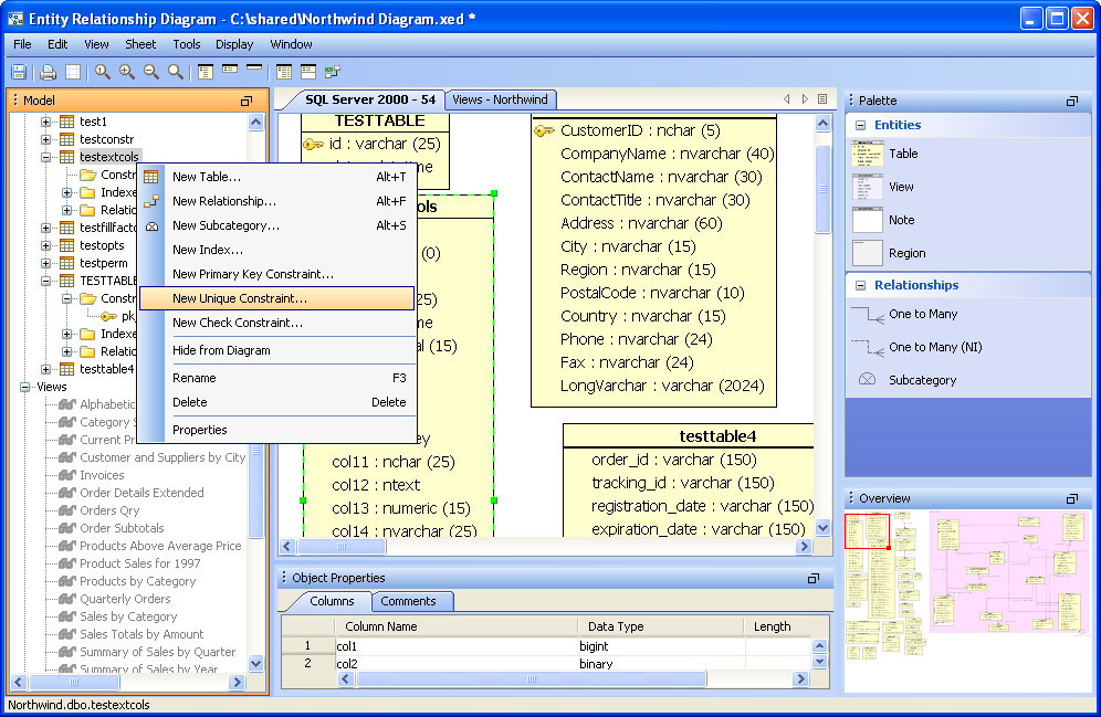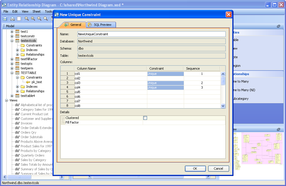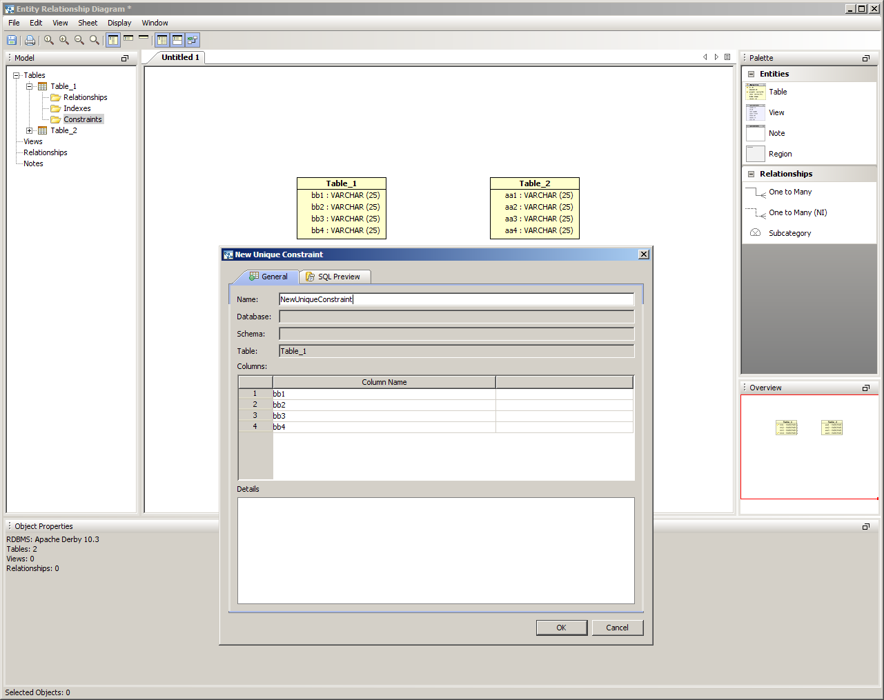 There are four methods for creating constraints within the ER Modeler. These methods work for Primary Key Constraints, Unique Constraints and Check Constraints. 1. Right clicking on a table entity in the sheet view and selecting "New Unique Constraint", "New Primary Key Constraint" or "New Check Constraint" from the context menu. 2. Right clicking on a table node in the the model node browser and selecting "New Unique Constraint", "New Primary Key Constraint" or "New Check Constraint" from the menu. 3. Expanding a table entity node in the model node browser, right clicking on the constraints node for that table and selecting "New Unique Constraint", "New Primary Key Constraint" or "New Check Constraint". 4. Left clicking on a table entity in the sheet view and choosing Edit->New Unique Constraint, "New Primary Key Constraint" or "New Check Constraint" from the ER Modeler application menu bar while the table entity is still selected in the sheet. Primary Key Constraints When the New Primary Key Constraint properties window appears, it must be named and columns must be included in the constraint. The column names on the left can be clicked to select them for participation in the constraint. Their constraint type "Primary Key" is indicated in the constraint column and the sequence in which they are clicked determines their order number in the Sequence column. Details on the Primary Key Constraint can be selected at the bottom of the properties window. Details at the bottom of the properties window vary based on database vendor and version. The Primary Key Constraint indicator in the Node Browser and Sheet view within a table entity resembles a key. The SQL Preview tab allows viewing of the DDL that the constraint creates when the model is converted into a script during forward engineering. Unique Constraints When the New Unique Constraint properties window appears, it must be named and columns must be included in the constraint.. Its table, database and schema display based on the table's corresponding information. The column names on the left can be clicked to select them for participation in the constraint. Their constraint type "Unique" is indicated in the constraint column and the sequence in which they are clicked determines their order number in the Sequence column. Details at the bottom of the properties window vary based on database vendor and version. The Unique Constraint indicator in the Node Browser and Sheet view within a table entity resembles a table with a protruding node at the top. The SQL Preview tab allows viewing of the DDL that the constraint creates when the model is converted into a script during forward engineering. Check Constraints When the New Check Constraint properties window appears, it must be named and a condition must be entered. Its table, database and schema display based on the table's corresponding information. There is an option to exclude the check constraint from replication. Details at the bottom of the properties window vary based on database vendor and version. The Check Constraint indicator in the Node Browser and Sheet view within a table entity resembles table with a check at the top. The SQL Preview tab allows viewing of the DDL that the constraint creates when the model is converted into a script during forward engineering. Sample Completed Table with Constraints The screenshot marked "Sample Completed Table with Constraints" contains two tables in a DB2 iSeries v5.4 database. The table on the left contains a Primary Key Constraint, a Unique Constraint and a Check Constraint as indicated by the Model Node Browser's Constraints tree. |