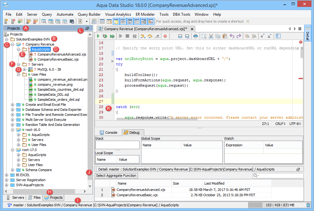 The Projects Browser functions as a navigational aid for AquaScript Project file management. Context sensitive menus are accessible through right-click on items within it or keyboard shortcut (ALT + DOWN ARROW). The Projects Browser can be separated or undocked as an individual window as part of the Workspace and Docking Framework of Aqua Data Studio. It uses a tree to display mounted folder and file contents, allowing for rapid location of files. When the Projects Browser is in focus, typing the first few letters of a word selects matching files or directories. When mounted local files are part of a file repository in Source Control or Version Control, the update status of files and directories appear as status indicators: up to date (green circle with a checkmark), out of date (red exclamation point), conflicted (yellow trianlge with exclamation point), or unversioned (empty circle). For more on Aqua Data Studio's version control client, and the Repository Browser, see Version Control in Aqua Data Studio.