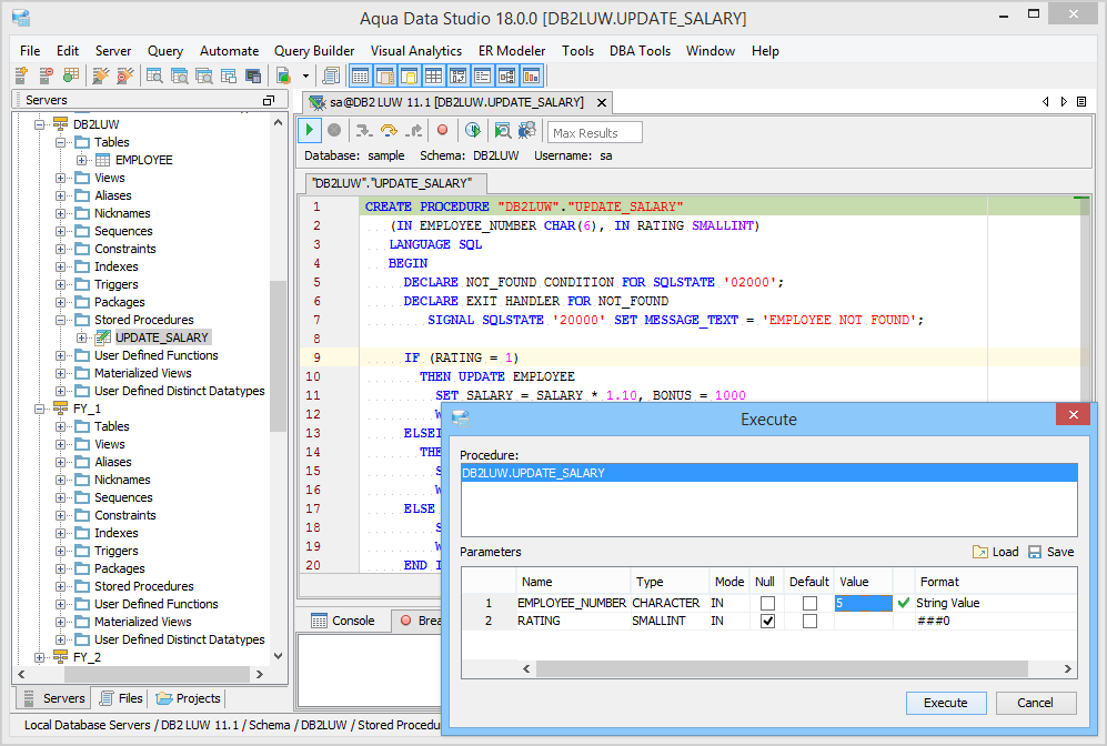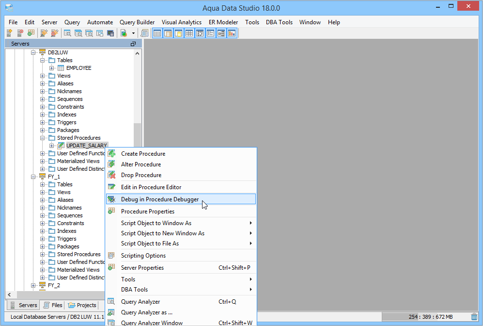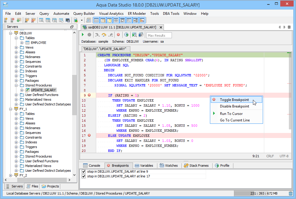 The DB2 SQL Debugger has been designed to help with testing and debugging of SQL stored procedures for DB2 versions 9.0 and above. Launching the DB2 SQL Debugger The DB2 Debugger is launched through a right click in the Schema Browser on Stored Procedures and selecting Debug in Procedure Debugger from the popup menu. More than one debugger can be open at once, with each object to be debugged opened in a separate tab. Debugger Workspace The debugger displays a slightly modified version of the Query Analyzer Toolbar containing debugger specific menus and buttons. Along the top of the debugger are the Execute, Stop, Step Into, Step Over, Step Return, Toggle Breakpoint, Turn On Profiling, Target Query Window, Debugger Query Window buttons. Next to the buttons is the Display Max Results input field. Beneath the buttons is the connection information, username and SID information. The procedure displays in the debugging window, within which breakpoints can be added by right clicking and selecting "Toggle Breakpoint" from the popup menu. When this window has focus, and a line has been clicked, it is also possible to select "Run to Cursor," to run the debugger up to that line in the procedure. From the same popup menu, "Go to Current Line" brings the cursor to the current line, which is very useful when debugging multiple lengthy procedures. Below the debugger window are tabs for Console, Breakpoints, Variables, Watches, Stack Frames and Profile. The Console tab displays any errors or messages generated as debugging progresses. The Breakpoints tab indicates the lines of the procedure where breakpoints are set and allows them to stop execution or not. The Variables tab lists any variables by name, their value and type. The Watches tab allows selecting specific variables to be observed as they change, reducing from a possible list of hundreds to a select group. The Stack Frames tab lists the local variables of the functions, and the arguments to them. The Profile tab lists commonly used terms or values a user works with on a regular basis in the debugging process. Once execution of a procedure has begun through the use of the Start button at the top of the debugger window, the bottom left of the window is occupied by the Text, Text History, Grid, and Pivot Grid Results tabs. This area functions just as the Query Analyzer window does, revealing the results of procedures at each breakpoint or execution cursor. The DB2 SQL Debugger features include:
