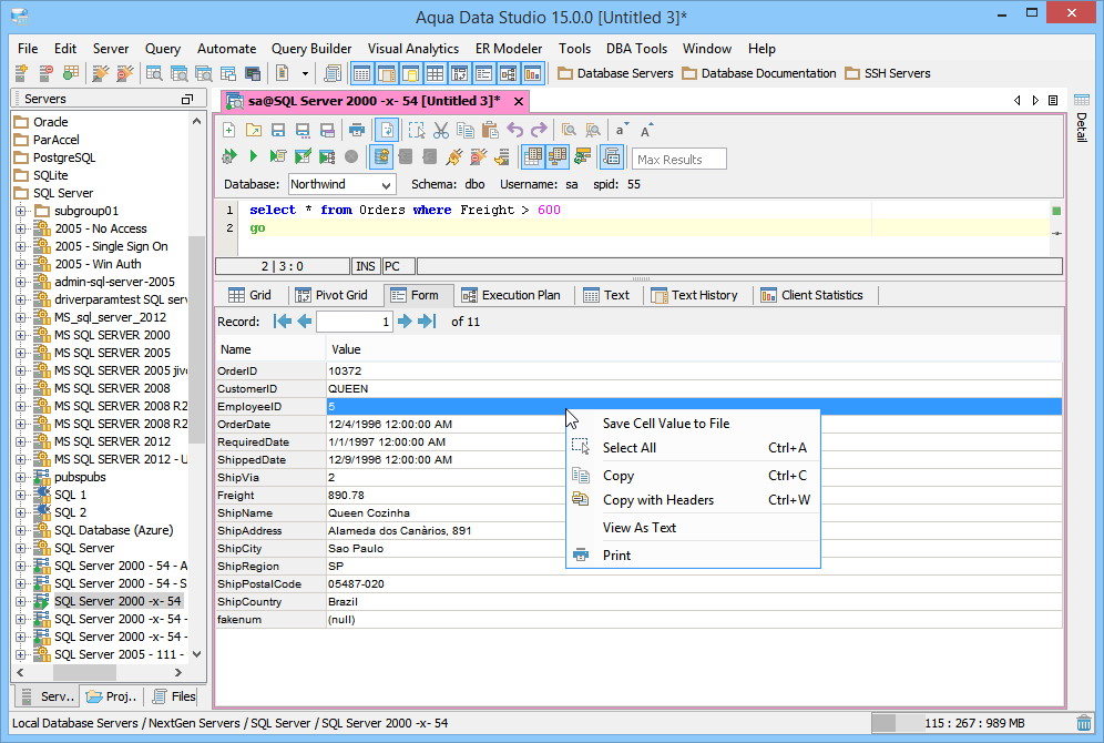 Grid Results -Results are displayed in a grid which can be sorted by clicking on column headings. One grid per statement is displayed. The Grid Results offers an expansive set of features for sorting, searching, saving, printing and other functionality. The column headers in the grid can be rearranged by dragging them, and sorted by CTRL + Click for multiple columns. Aggregate Functions display statistics on selected data from the grid. The Quickfilter at the top right of the grid rapidly filters what results are currently displayed. When there are multiple statements separated by GO or /, the SQL Preview icon at the top left of each Grid Result assists in identifying what statement generated each Grid Result. Grid Results can also be Pinned Enabling ONLY Grid Results BEFORE querying a large results sets (100,000 rows or more) vastly increases Aqua Data Studio's speed, and dramatically lowers its memory footprint. Grid Results are the preferred method of viewing query results in the Query Analyzer. |