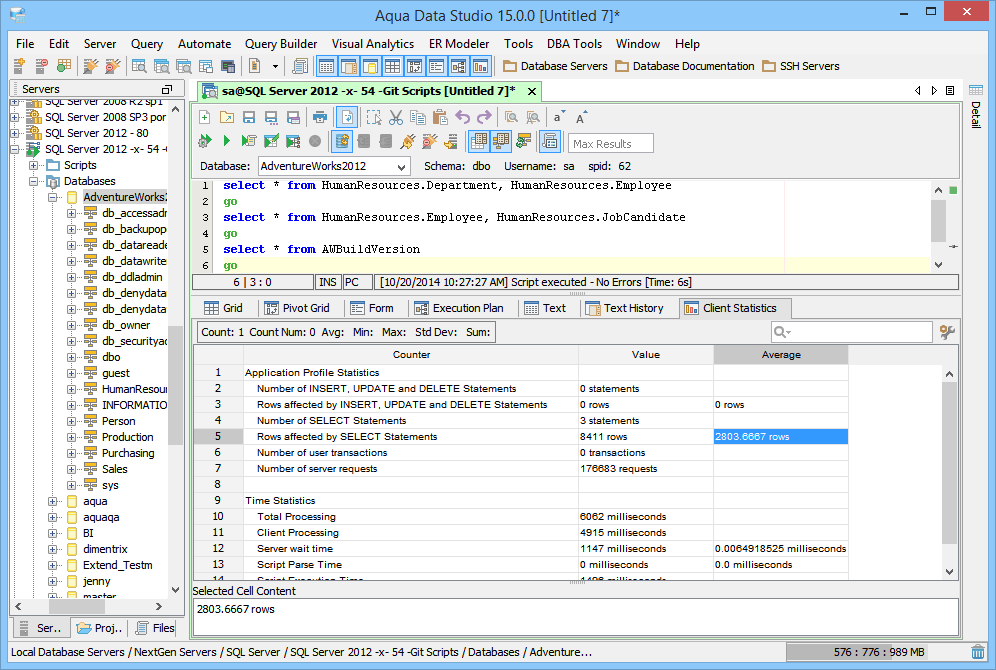 Client Statistics - Displays detailed statistics on the execution of the statement or script. |