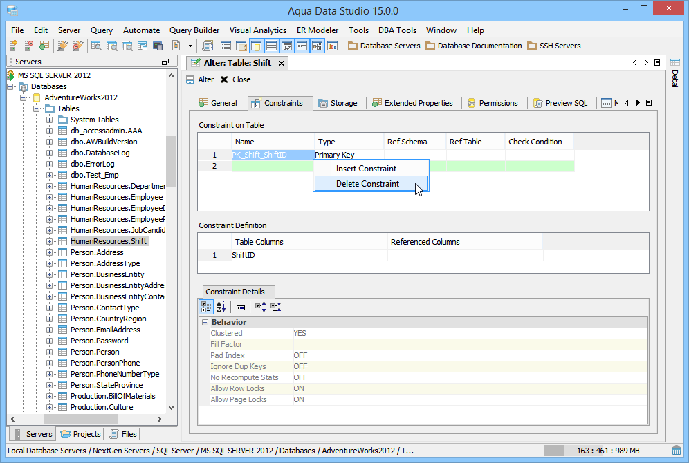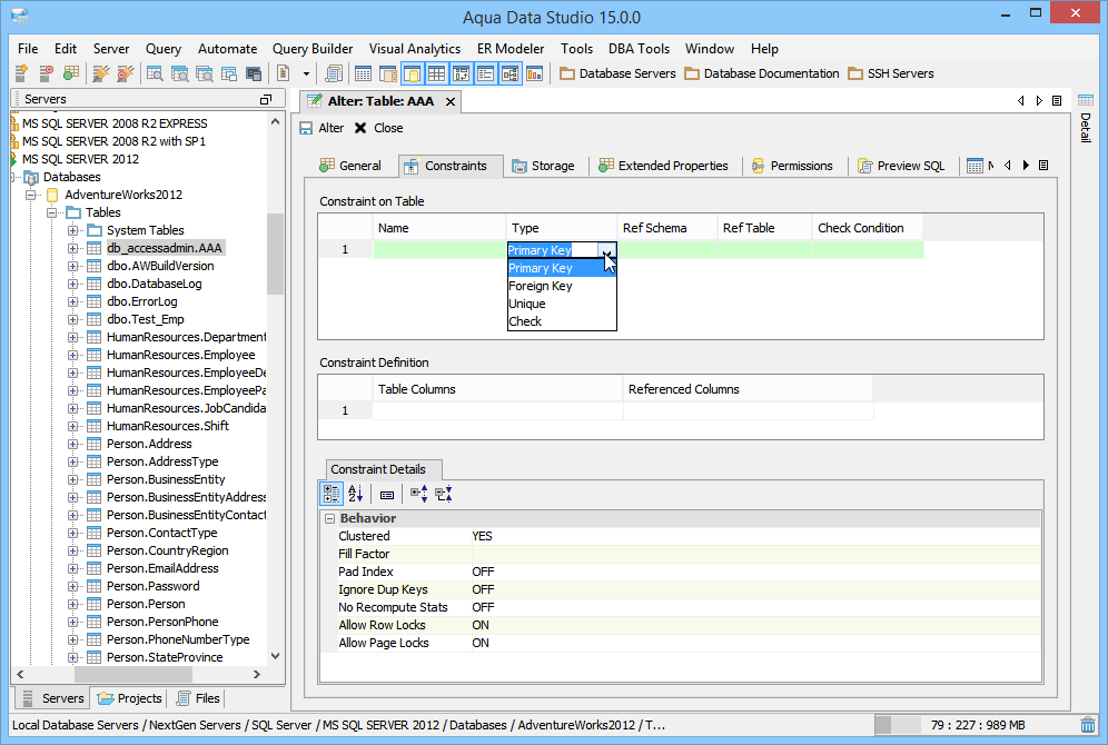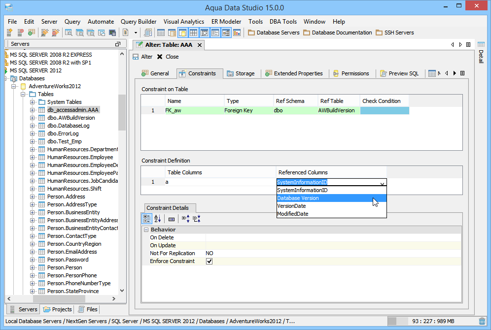 Aqua Data Studio provides visual editors for creating and editing database table Constraint objects. Constraints can be visually edited through the Create Table and Alter Table property windows, launched from a right click in the Schema Browser. Within the Alter and Create Table property windows, the Constraints Tab allows selection and editing of Table Constraints for Primary Key Constraints, Foreign Key Constraints, Unique Constraints and Check Constraints. After constraints have been set in the Constraints Tab, the Preview SQL tab displays the DDL used to generate them. When ER Models are generated from databases in the Schema Browser, constraints are visible within table entity objects. Primary Key Constraints A Primary Key is a candidate key to uniquely identify each row in a table. A table is allowed one Primary Key constraint, and a column that is part of the Primary Key constraint cannot take null values. Because Primary Key constraints ensure unique data, they are most often defined on an identity column. To create a Primary Key Constraint, enter a Primary Key Name in the name column of the Constraints table, then select Primary Key from the Type Column dropdown. In the Constraint Definition pane, select the table columns from the table that are part of the Primary key. A Primary Key Constraint is represented by a table icon with gold node when viewed in the Constraints container in the Schema Browser. Foreign Key Constraints A Foreign Key is a referential constraint between two tables. The foreign key identifies a column or a set of columns in one (referencing) table that refers to a column or set of columns in another (referenced) table. The columns in the referencing table must be the primary key or other candidate key in the referenced table. The values in one row of the referencing columns must occur in a single row in the referenced table. To create a Foreign Key Constraint, enter a Foreign Key Name in the name column of the Constraints table, then select Foreign Key from the Type Column dropdown. Select the Reference Schema and Reference Table. In the Constraint Definition pane, select the columns from the tables that are set in the Reference Table of the Foreign Key. A Foreign Key Constraint is represented by a table icon with gold node and black square when viewed in the Constraints container in the Schema Browser. Unique Constraints A Unique Constraint uniquely identifies all possible rows that exist in a table. Unique Constraints make sure that no identically copied values are entered in specific columns that do not participate in a primary key. Multiple Unique Constraints can exist on a single table. To create a Unique Constraint, enter a Unique Constraint name in the name column of the Constraints table, then select Unique Constraint from the Type Column dropdown. In the Constraint Definition pane, select the columns from the columns needed. A Unique Key Constraint is represented by a table icon with crossed node when viewed in the Constraints container in the Schema Browser. Check Constraints A Check Constraint (also known as table check constraint) is a condition that defines valid data when adding or updating an entry in a table of a relational database. Within the Constraints Tab of Create or Alter Table, the Check Condition column is where the condition is set, determining what the table considers valid data for the selected column. To create a Check Constraint, enter a Check Constraint Name in the name column of the Constraints table, then select Check Constraint from the Type Column dropdown. Enter the formula for the check in the Check Condition field. A Check Constraint is represented by a table icon with gold node and green check when viewed in the Constraints container in the Schema Browser. Sample Table with Constraint Types The screenshot labeled "Table with constraint types" shows the Alter Table dialog for a table from the AdventureWorks database in Microsoft SQL Server 2012. |