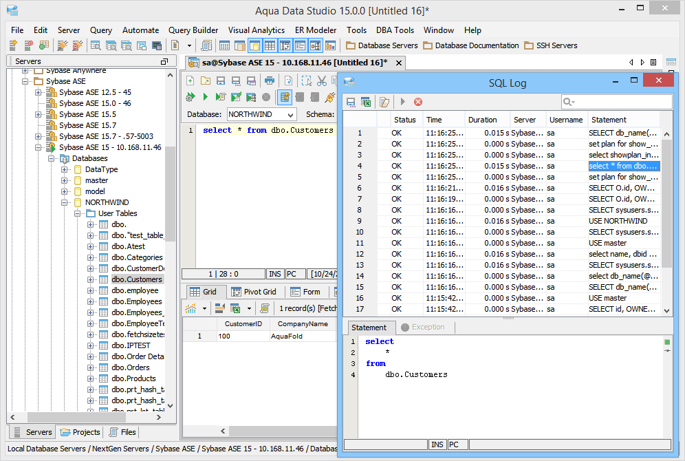The SQL Log is a visual log tool for recording any SQL queries executed by Aqua Data Studio; all queries manually executed in the Query Analyzer by you the user and any of Aqua Data Studio's internal queries for displaying information within the GUI. When the SQL Log is opened, it immediately begins recording and provides a much more detailed capture of database interaction than the SQL History alone. If the Schema Browser is used to expand a database object to view its content, the SQL Log instantly displays the query the application uses to retrieve that information. This makes it an effective tool for monitoring the execution of statements within Aqua Data Studio.